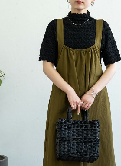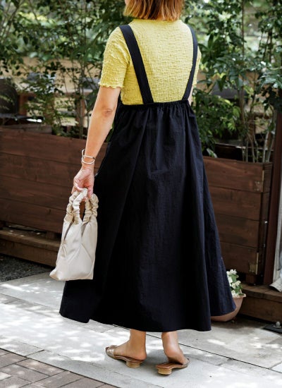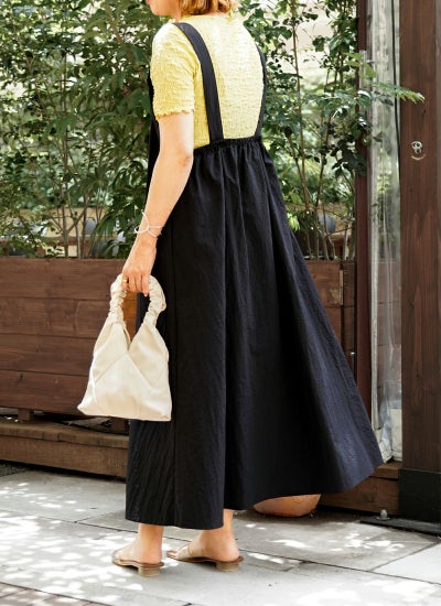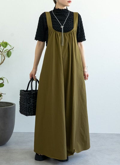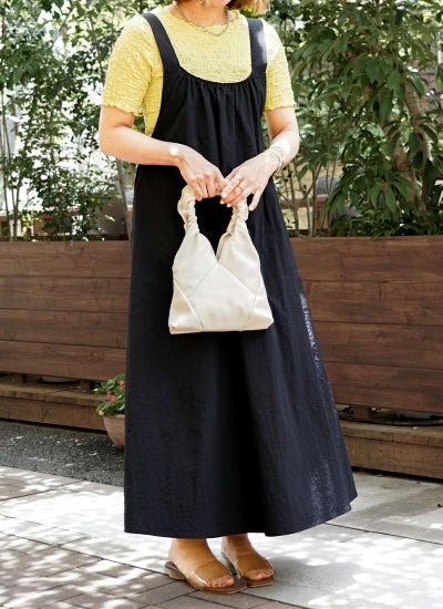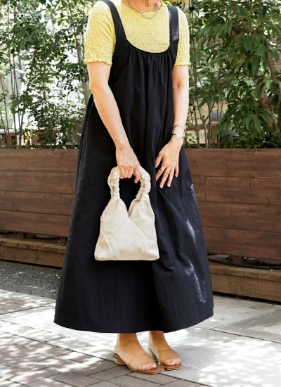 無地のワンピースなのでトップスを選ばず、幅広く活躍。