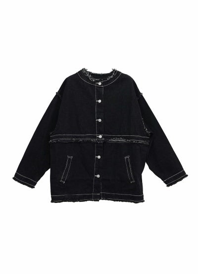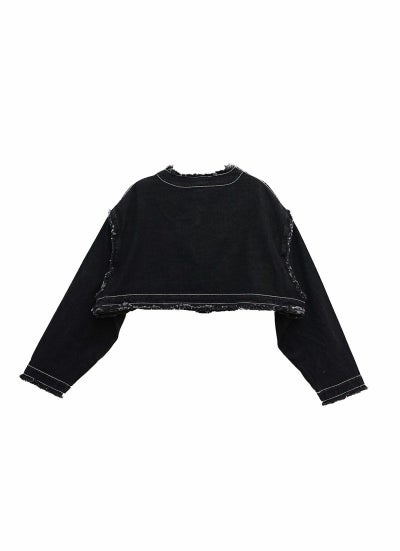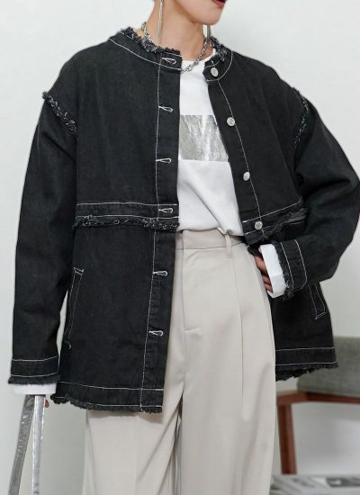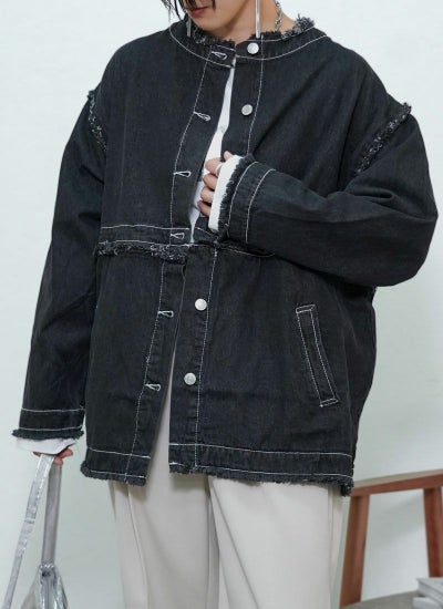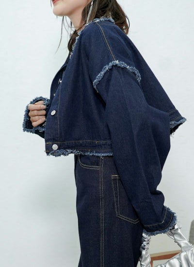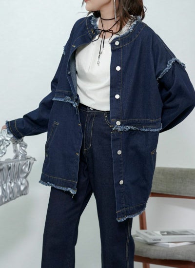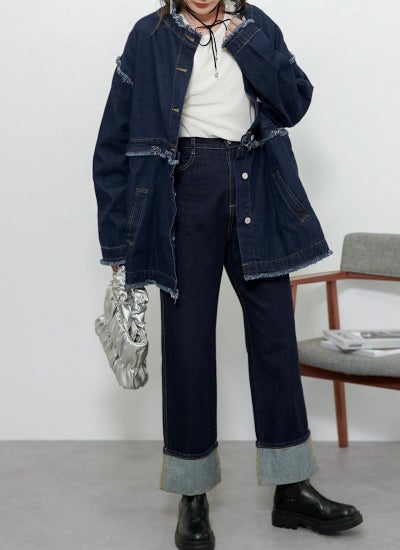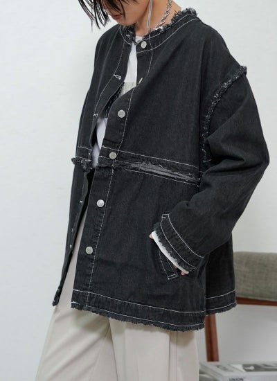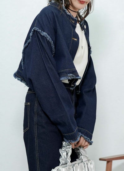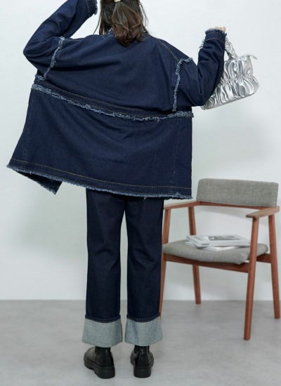 襟や袖元などにフリンジ加工が施され、トレンドライクな着こなしが叶います。
