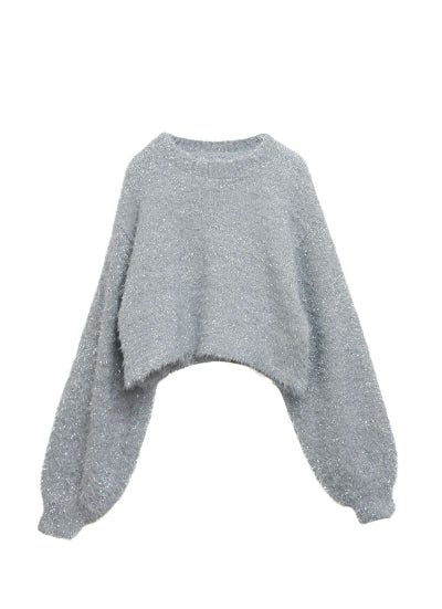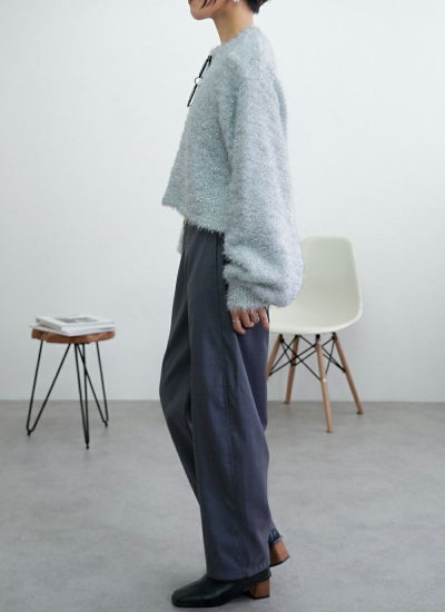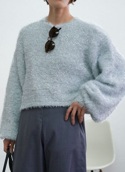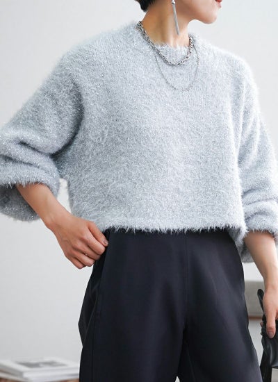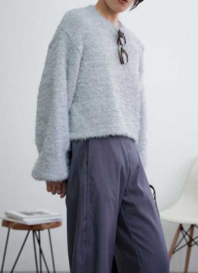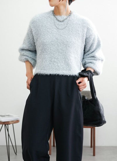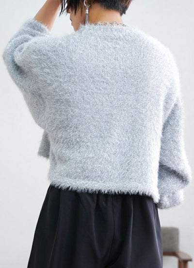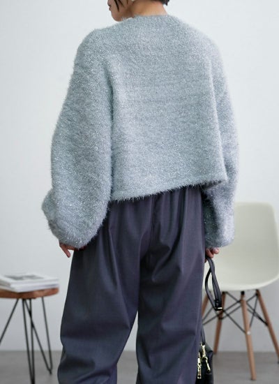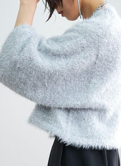 フェザーの糸と、ラメのフェザーを引きそろえたショート丈ニット。
