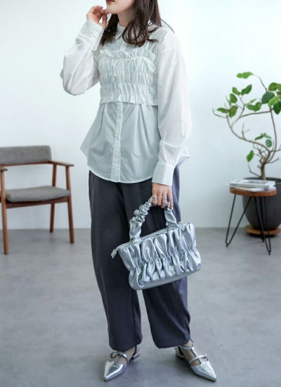 シャツ単体で羽織りにしても良し、ビスチェをベーシックニットトップスと合わせても可愛いです。