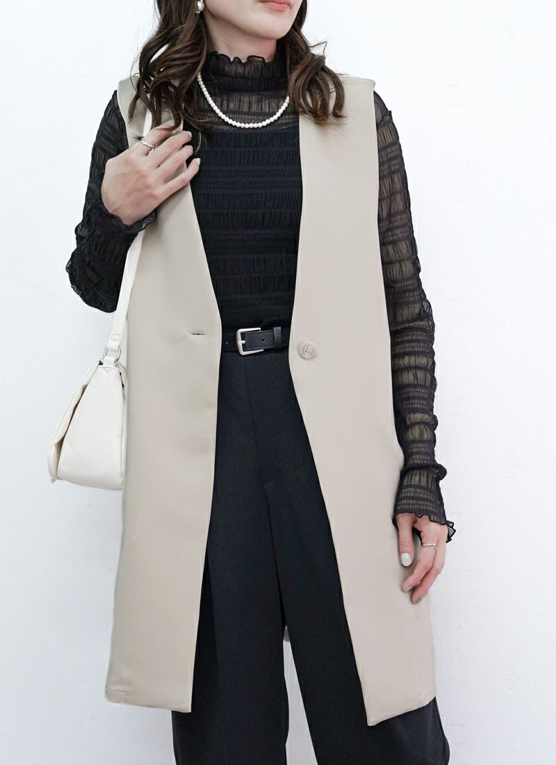 ラフに着られるノーカラーデザインで、すっきりしたシルエットが魅力の一枚。