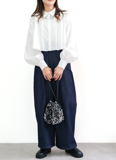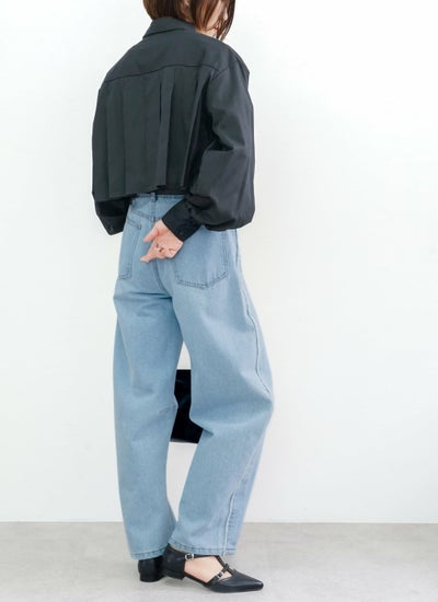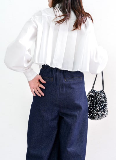 広がるプリーツでウエストまわりに空間が生まれ、ハイウエストやボリュームあるボトムスを合わせれば、女性らしいメリハリあるシルエットのスタイリングへと導いてくれます。