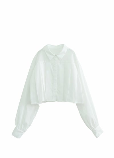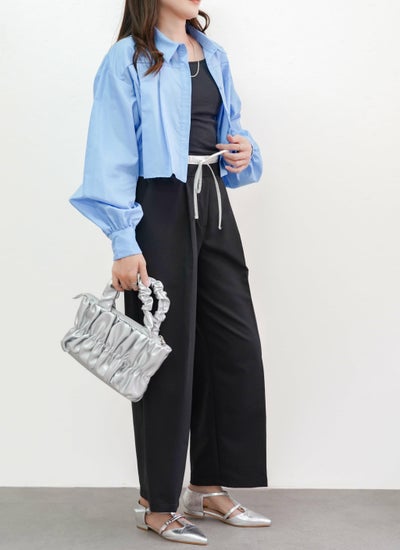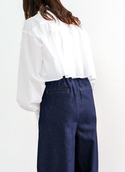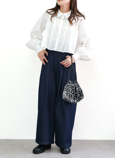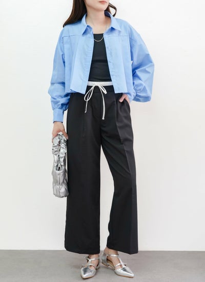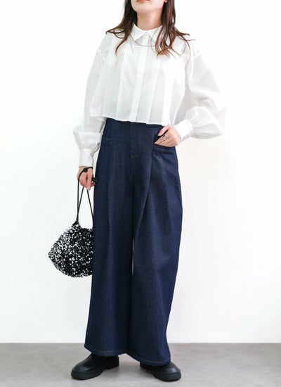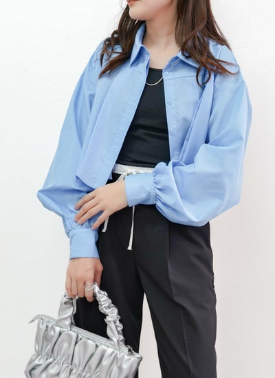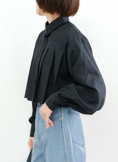 丈の短い短丈のクロップド丈のブラウスで、前ボタンをあけてシャツカーディガンとして羽織りに使うのもおすすめ◎