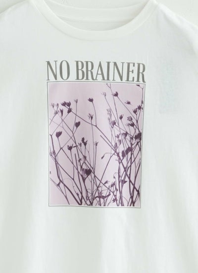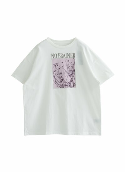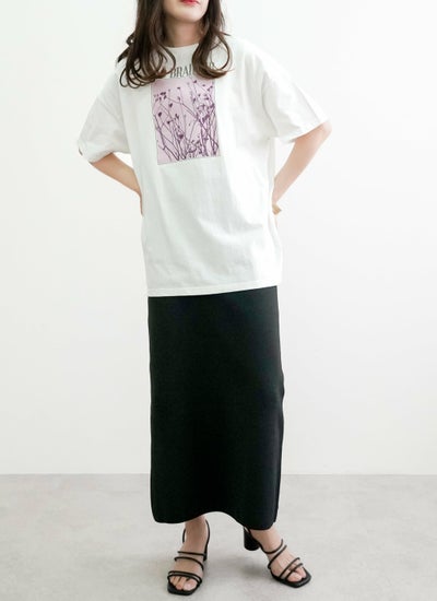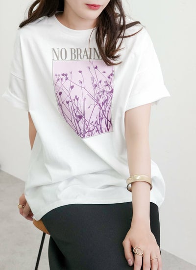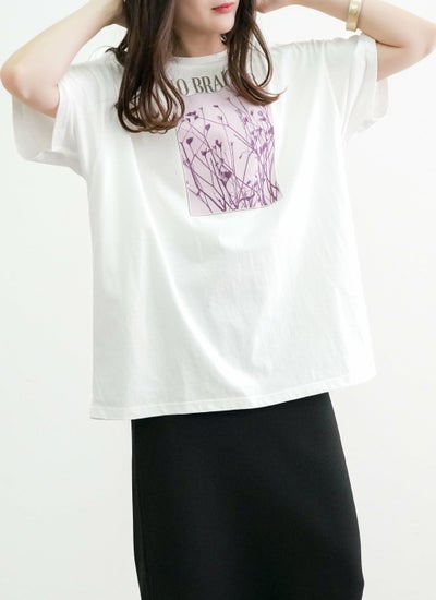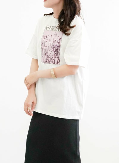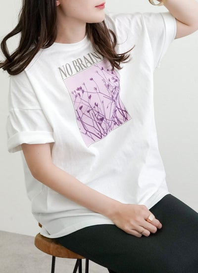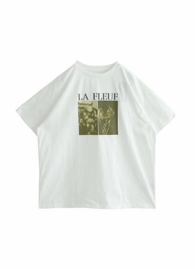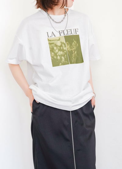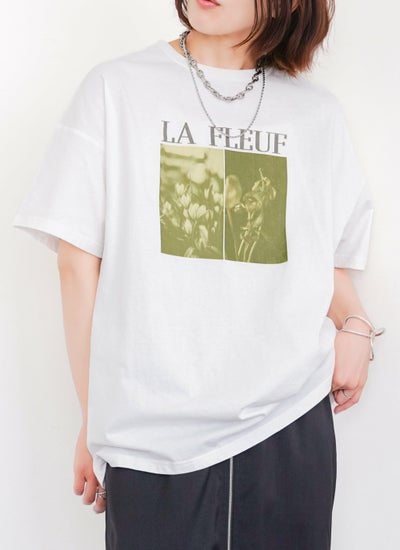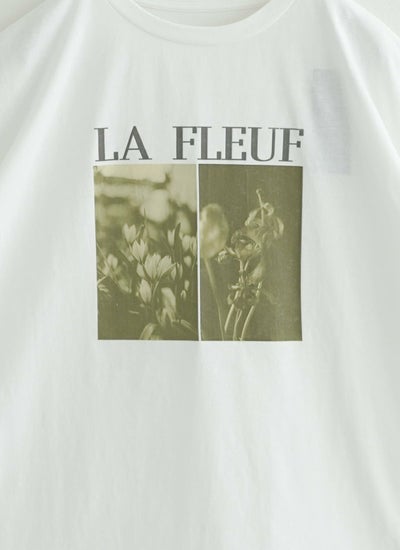 洗練されたロゴと花の写真風プリントが特徴的な半袖Tシャツ。