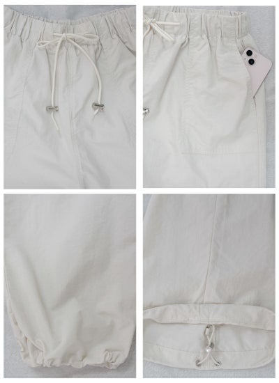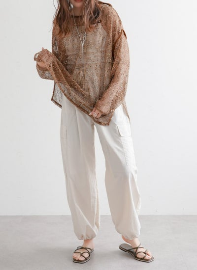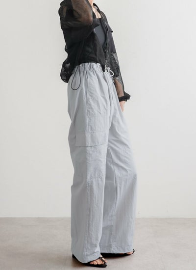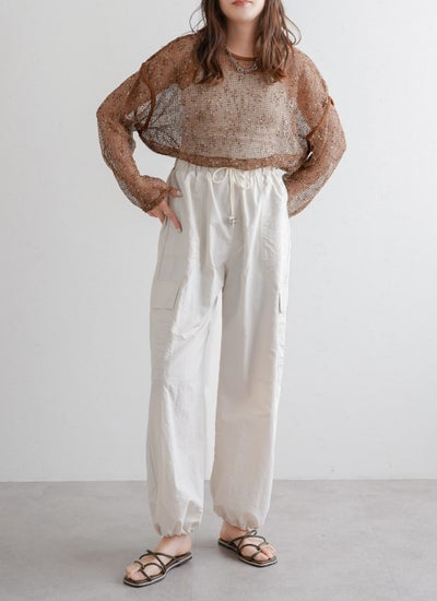 ウエストや裾はドロスト仕様で調節が可能で、裾を絞らず穿くとストレートなシルエットに。