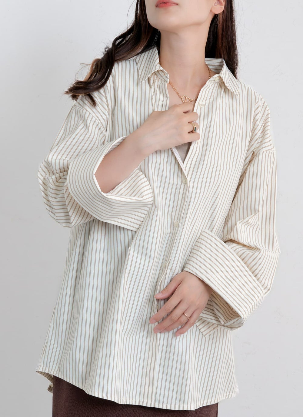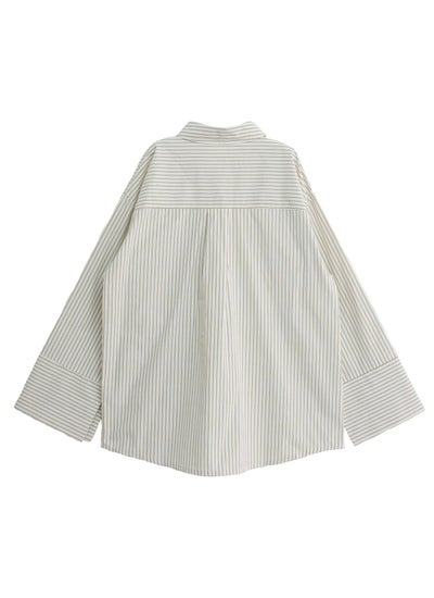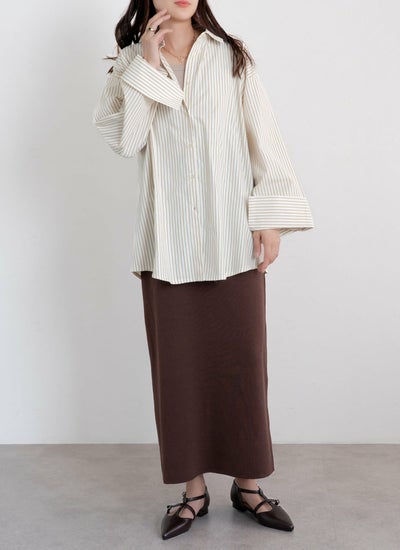 主張控えめの上品なストライプ柄に、袖口はビックカフスでデザインにアクセントを。