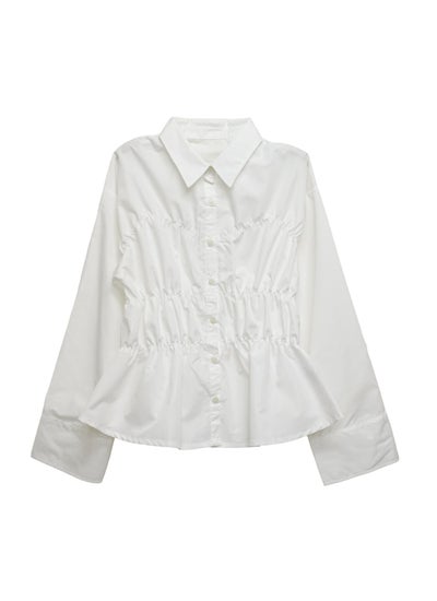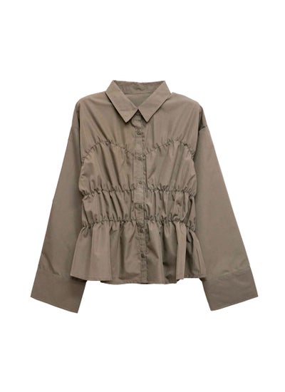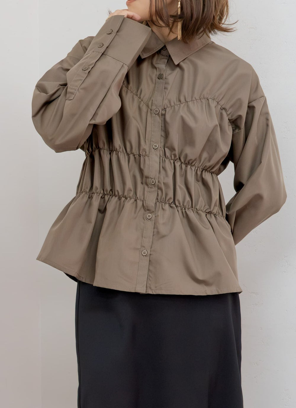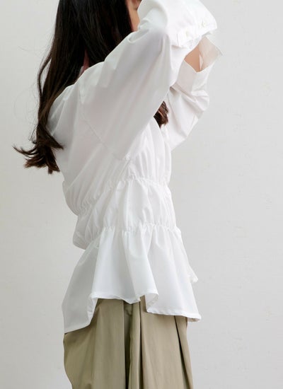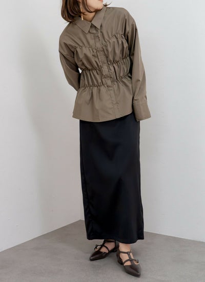 ハリ感のあるブロード生地にシャーリングを効かせた、モードな印象のデザインシャツ。