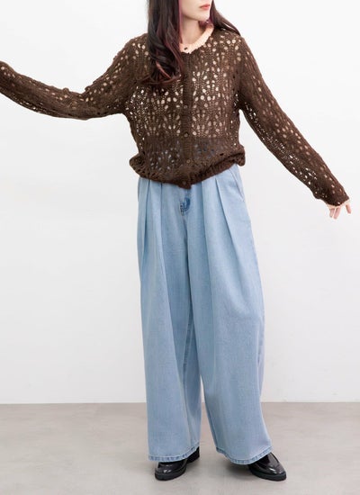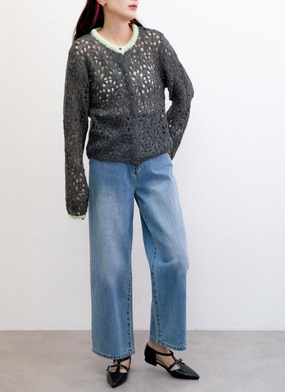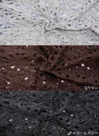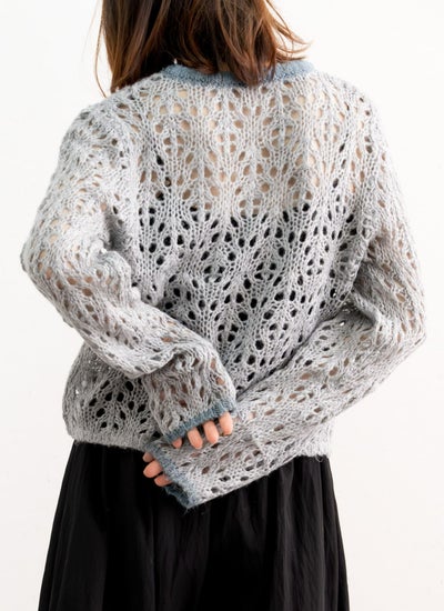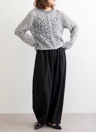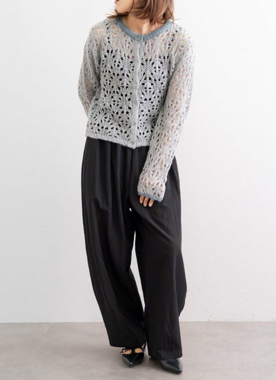 ふんわりモヘア糸を使用した透かし編みが軽やかな印象のニットカーディガン。