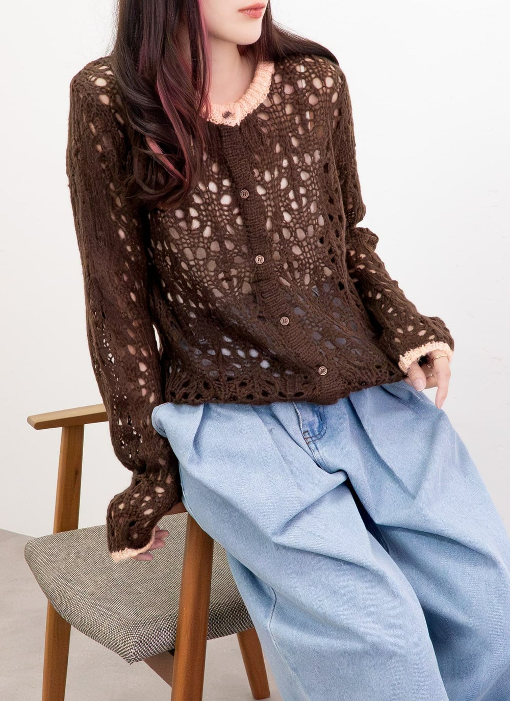 5. 【20%OFF】透かし柄配色クルーネックカーデ