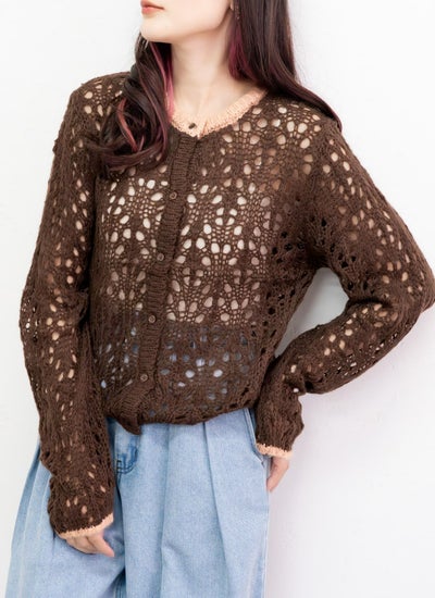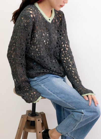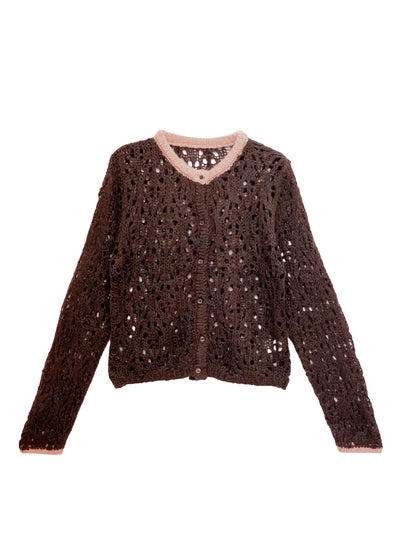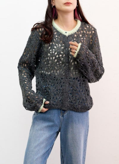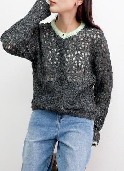 revoam【透かし編みが軽やかなニットカーデ】 【20%OFF】透かし柄配色クルーネックカーデ