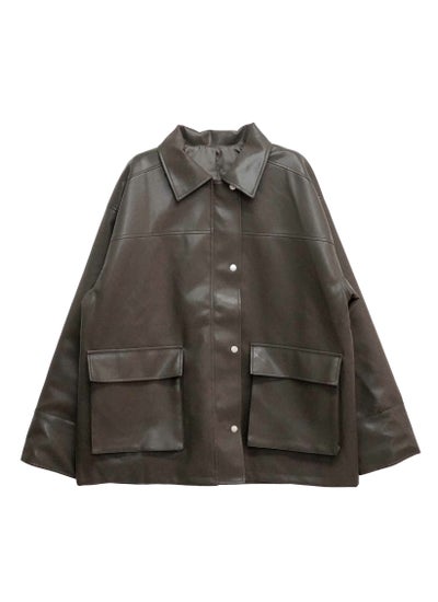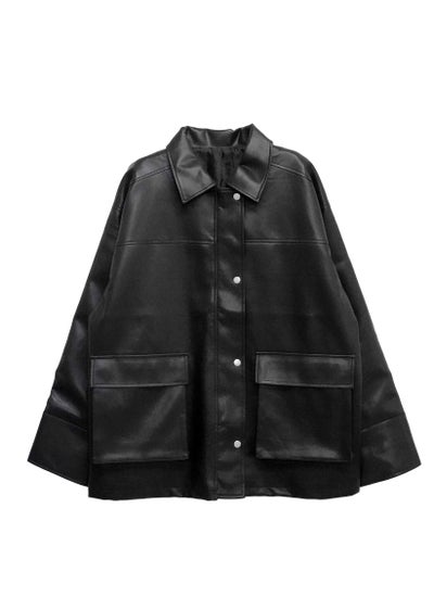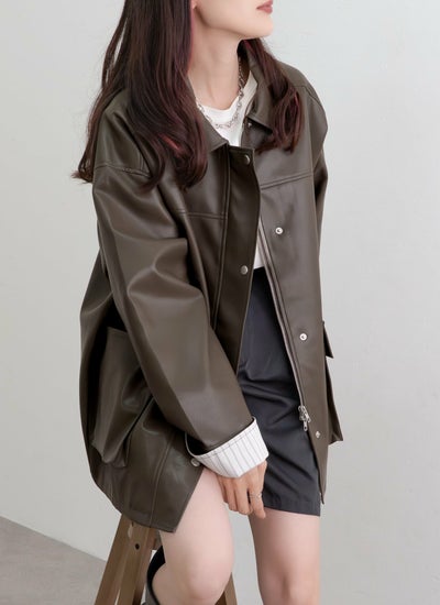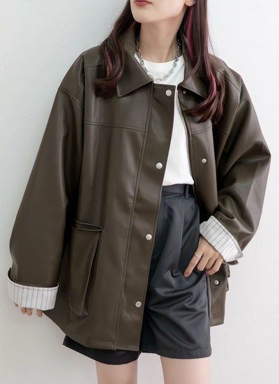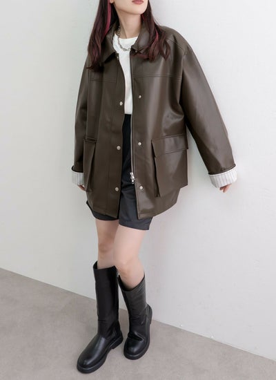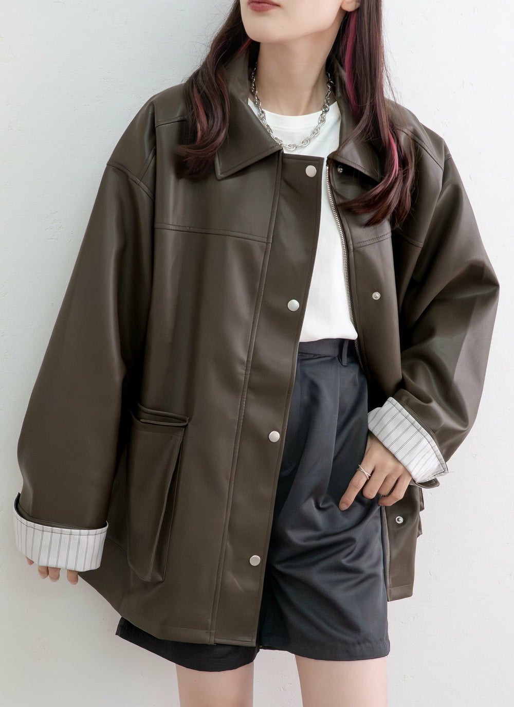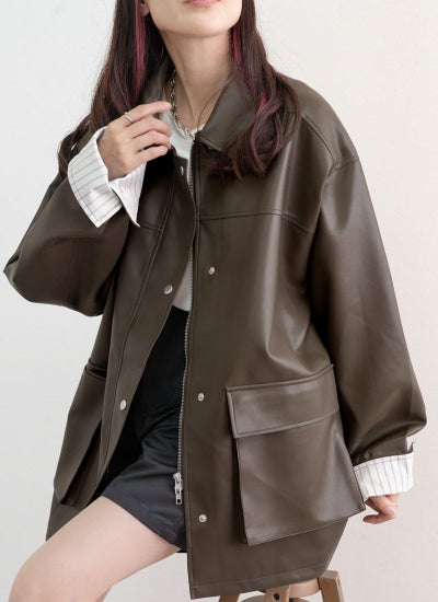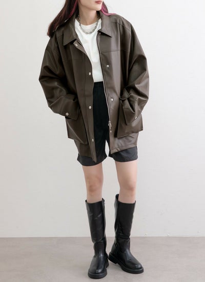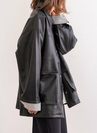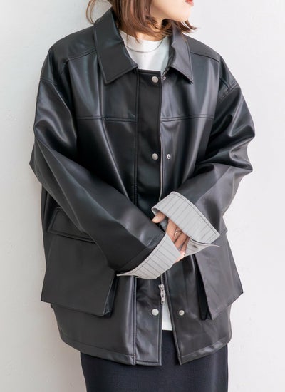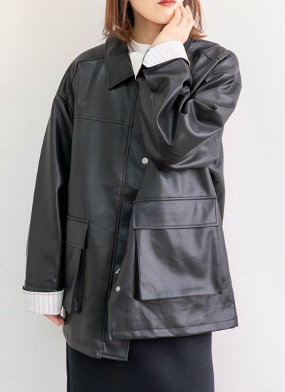 今季注目アウターのカバーオールをフェイクレザーで大人っぽい雰囲気に◎