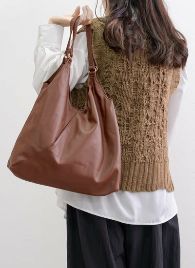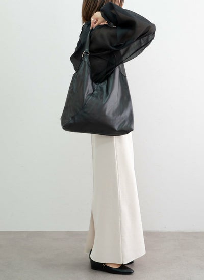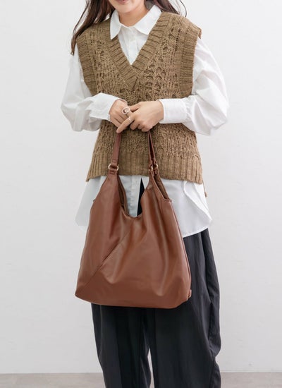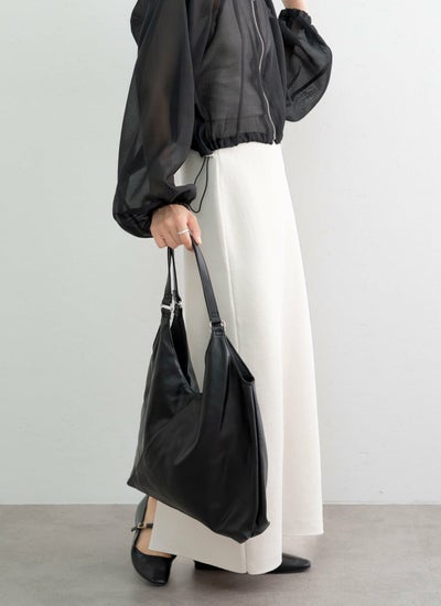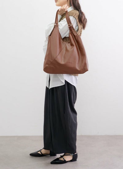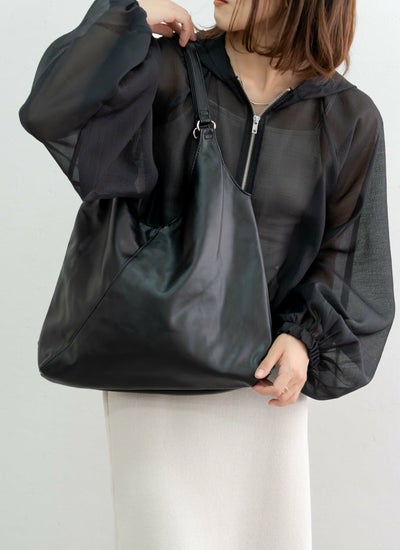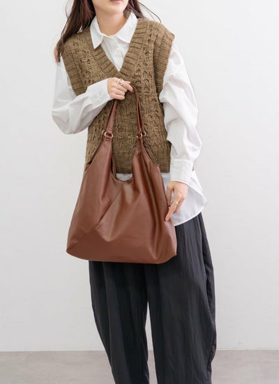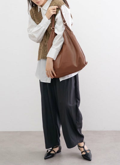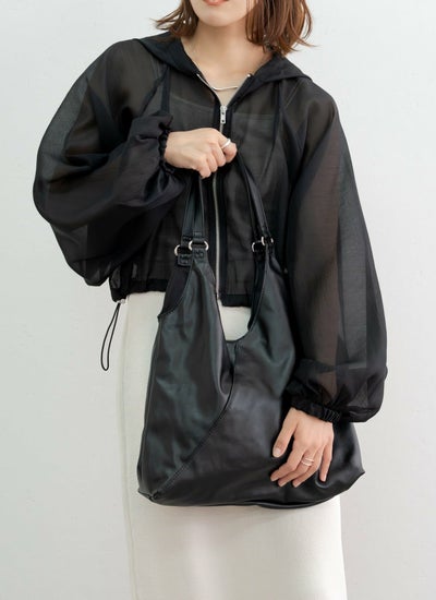 軽くて柔らかい合皮を使用しているので肩掛けもしやすい!切り替えデザインにはスマホなどを入れるのに便利なポケット付きです。