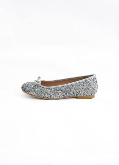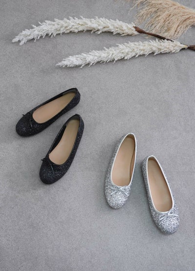 キラッと光る、グリッターデザインのリボン付きパンプス。