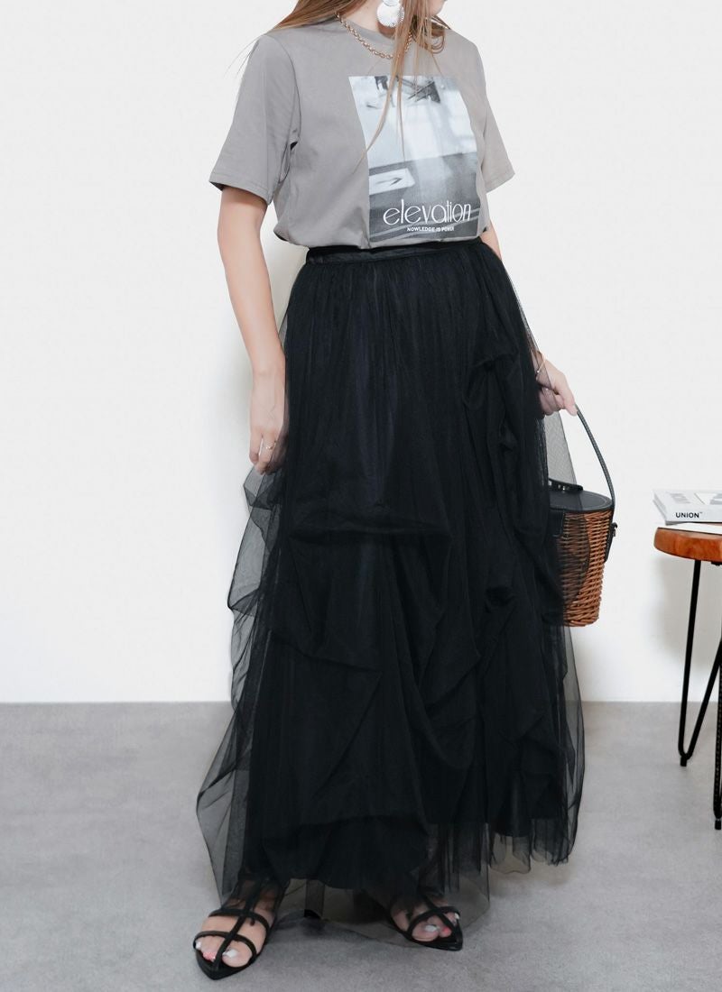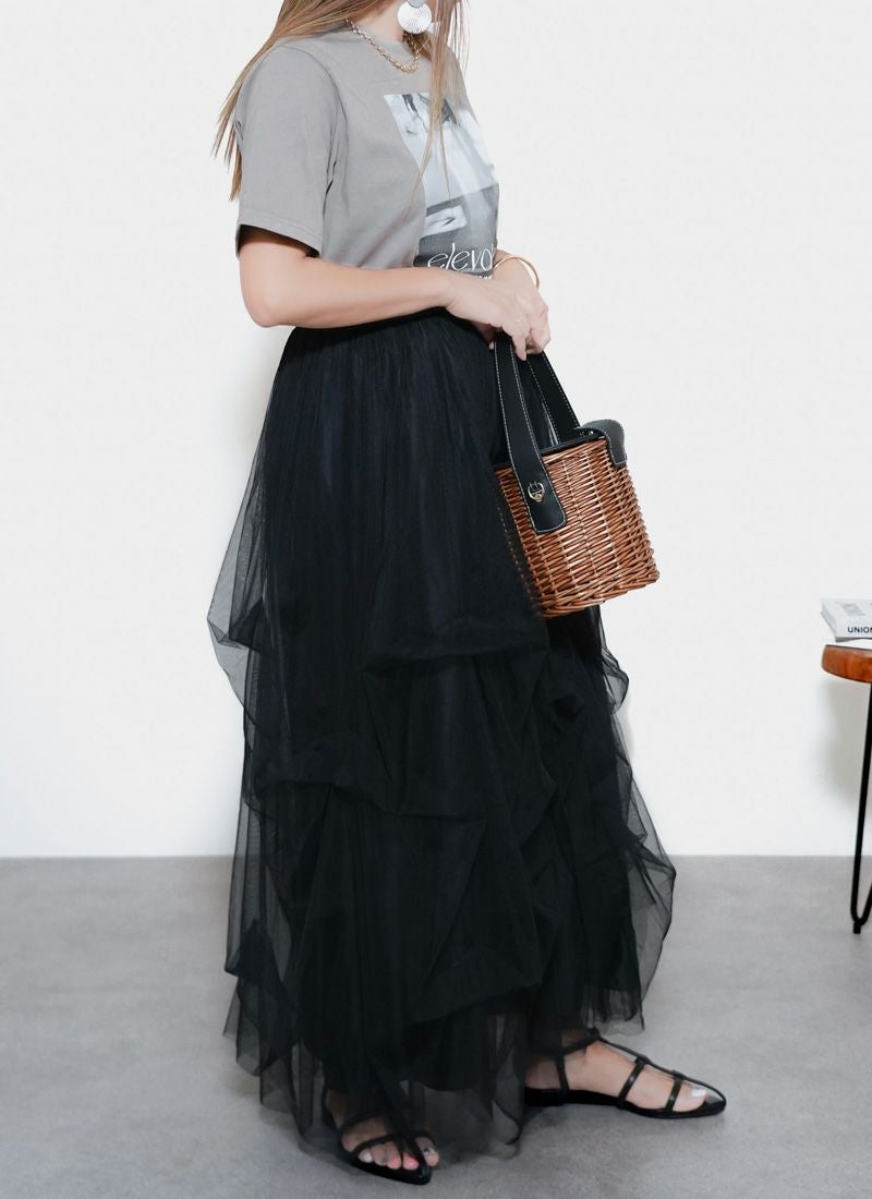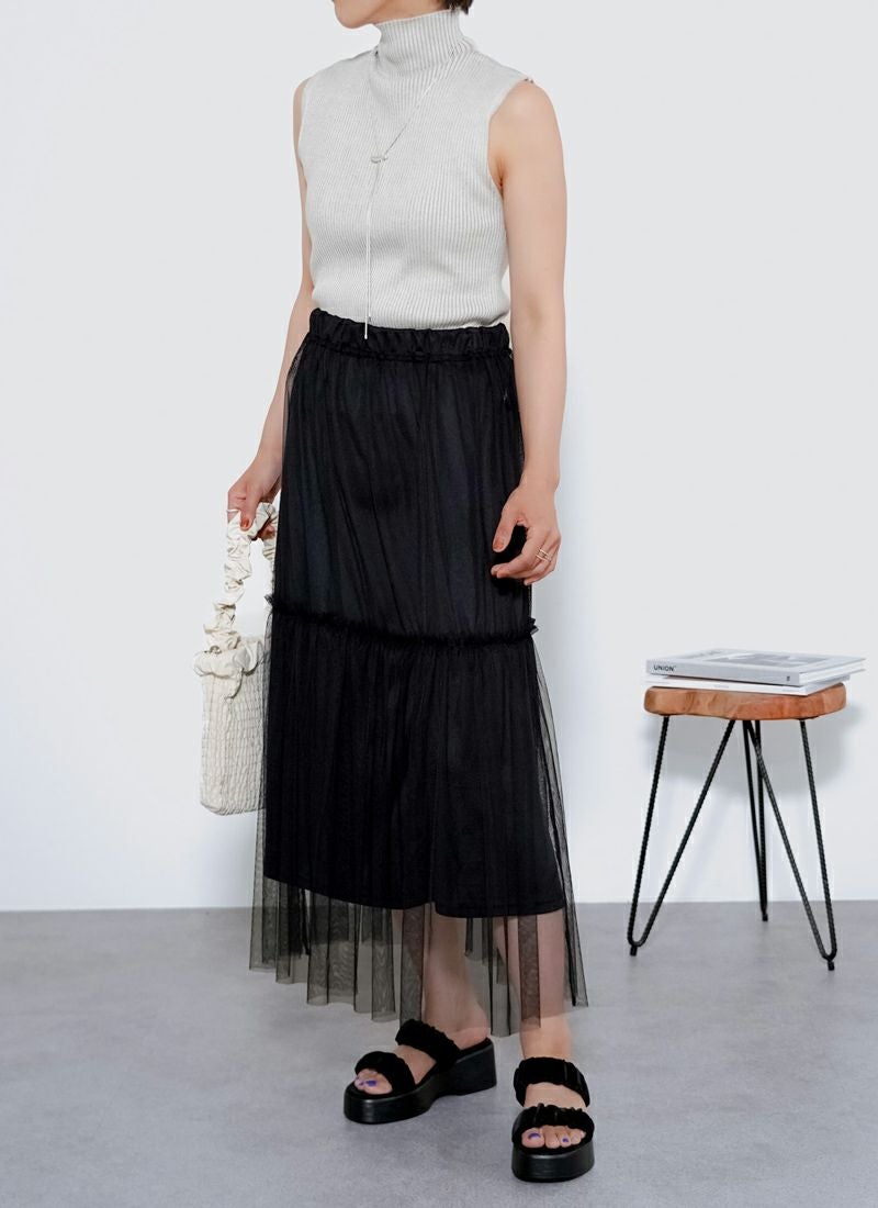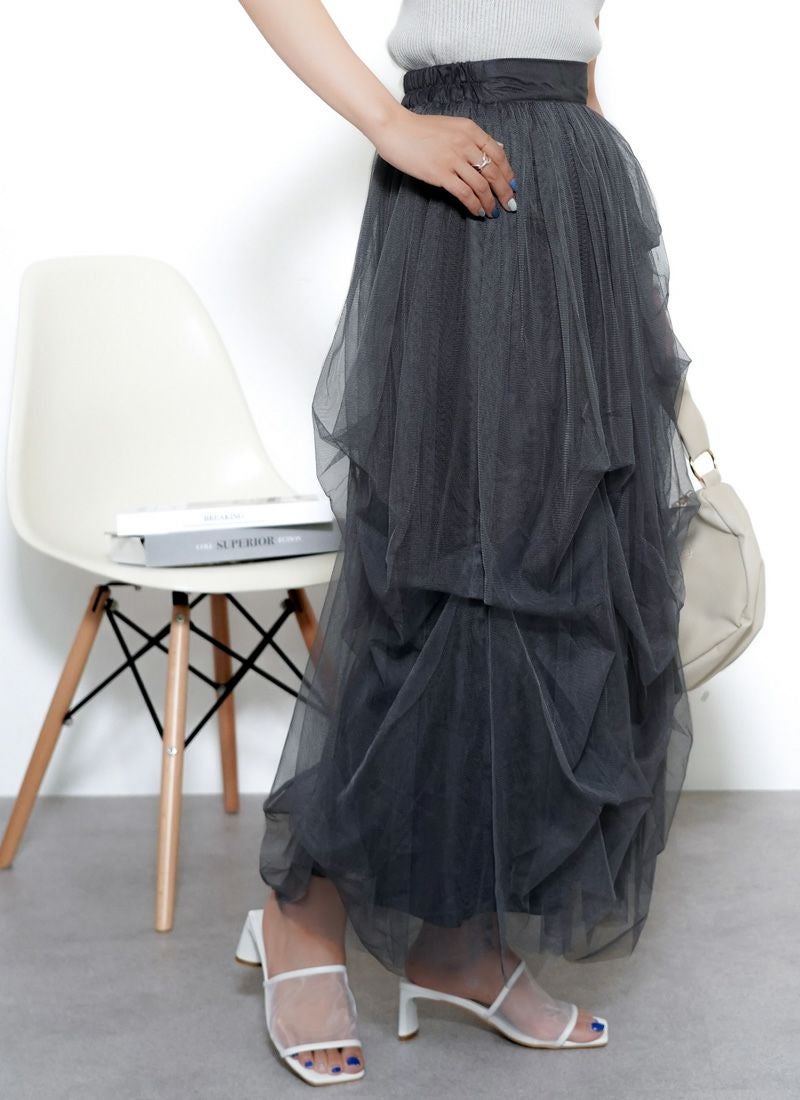 revoam【大人フェミニンに着こなす、ふんわり軽やかロングスカート】 【25%OFF】タックボリューム チュールスカート