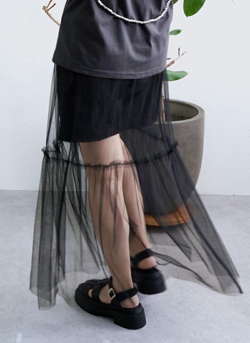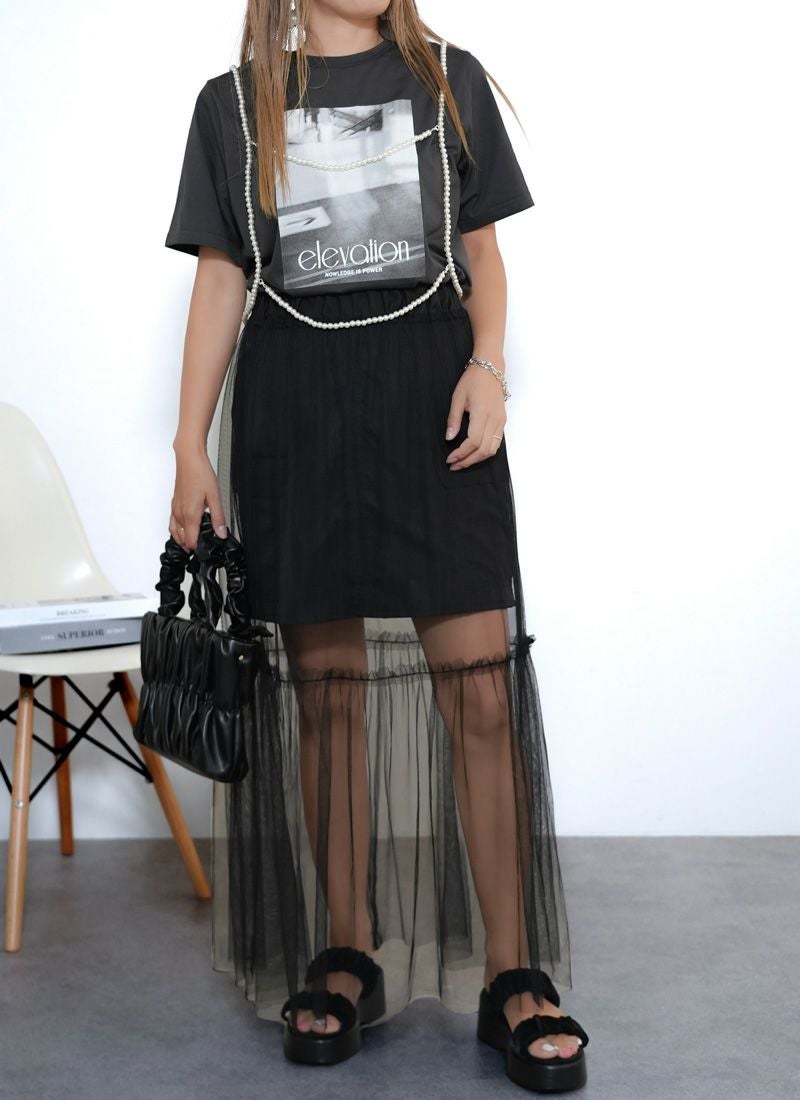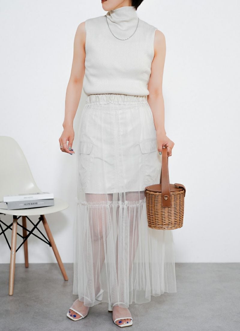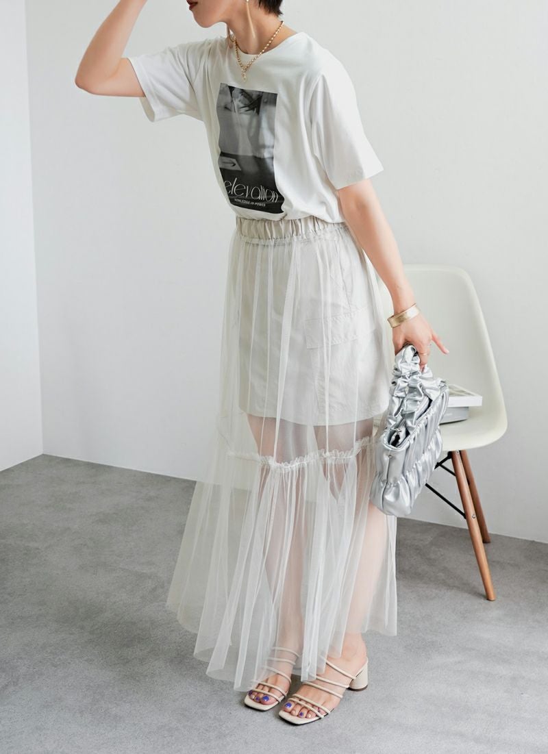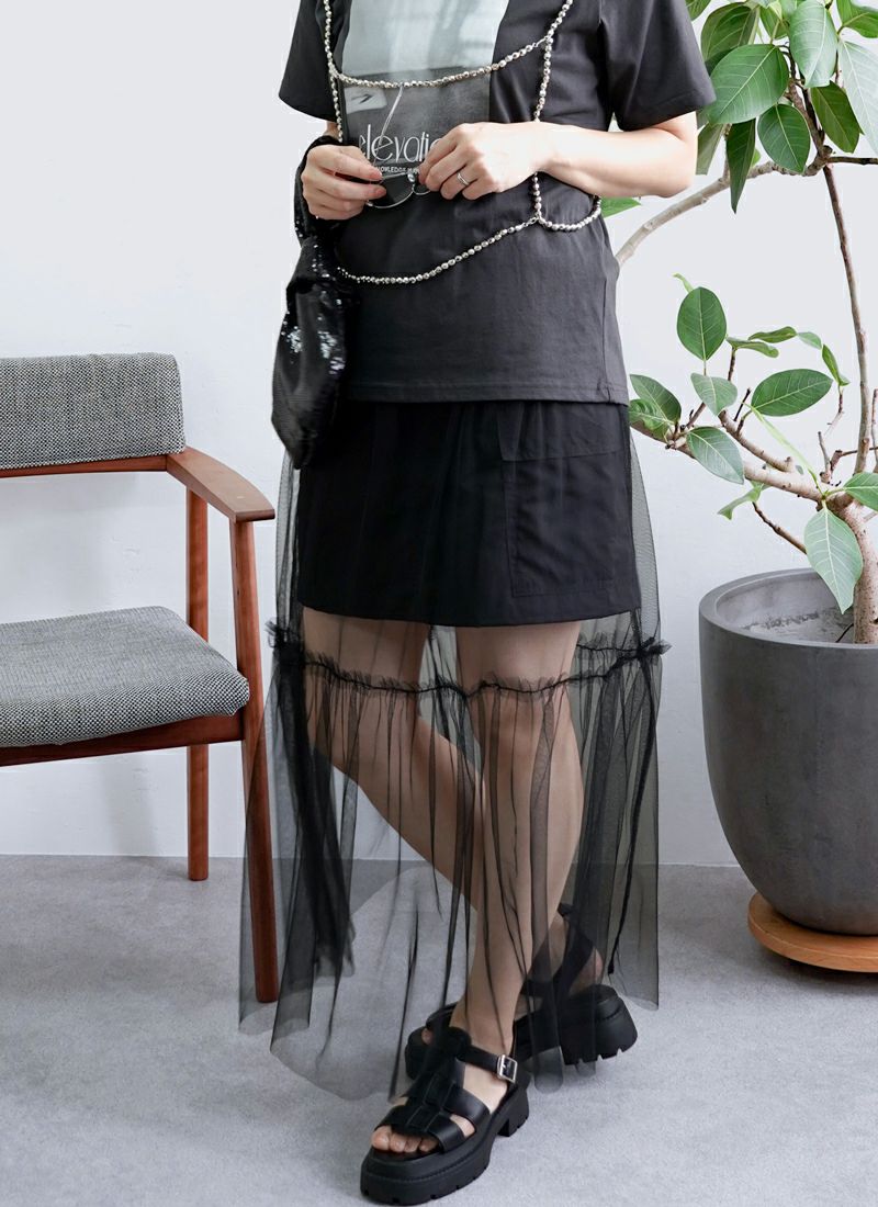 revoam【透け感×ボリュームが、ひと目で可愛い。動きに揺れる、レイヤードチュールスカート】 【25%OFF】タフタ×チュール レイヤードスカート