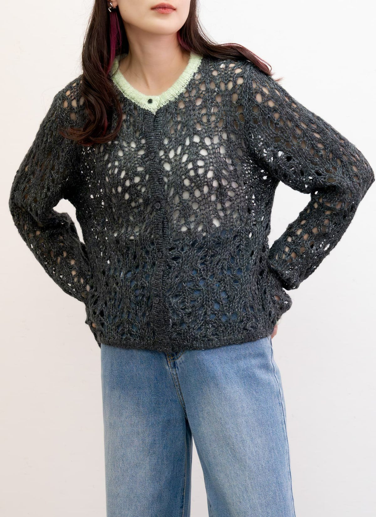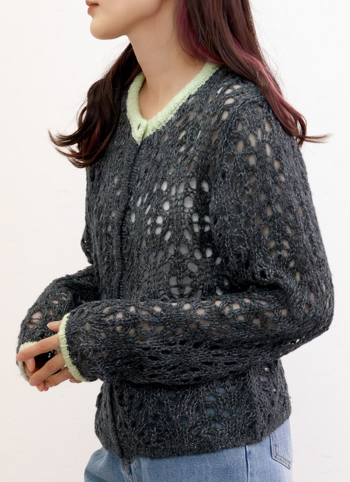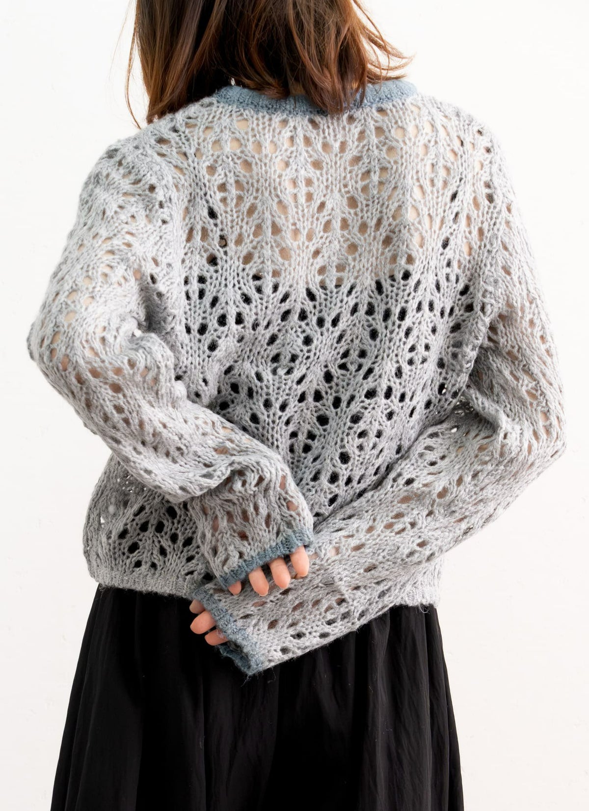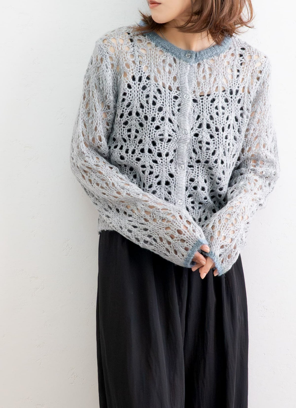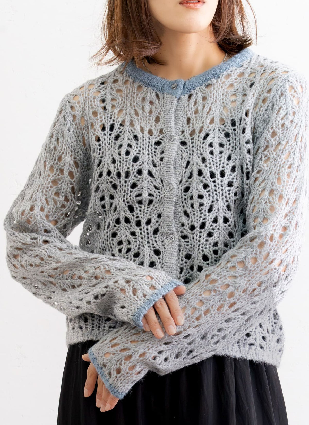 revoam【透かし編みが軽やかなニットカーデ】 【20%OFF】透かし柄配色クルーネックカーデ