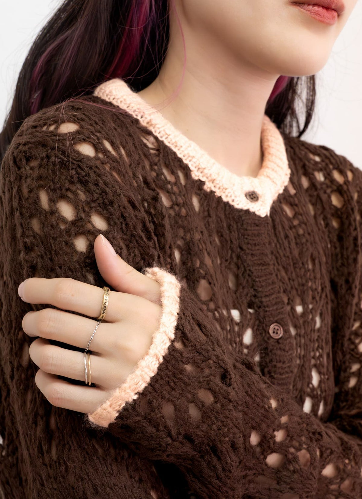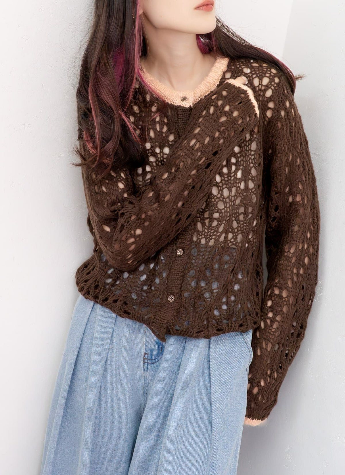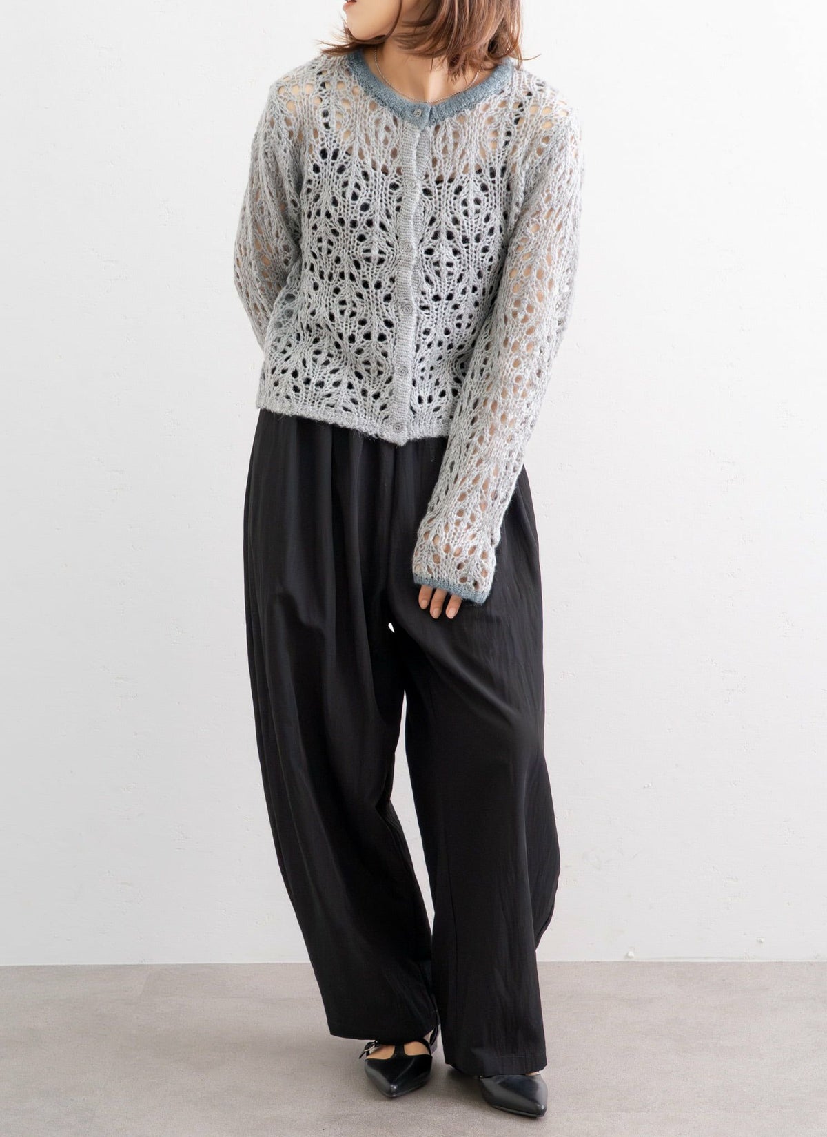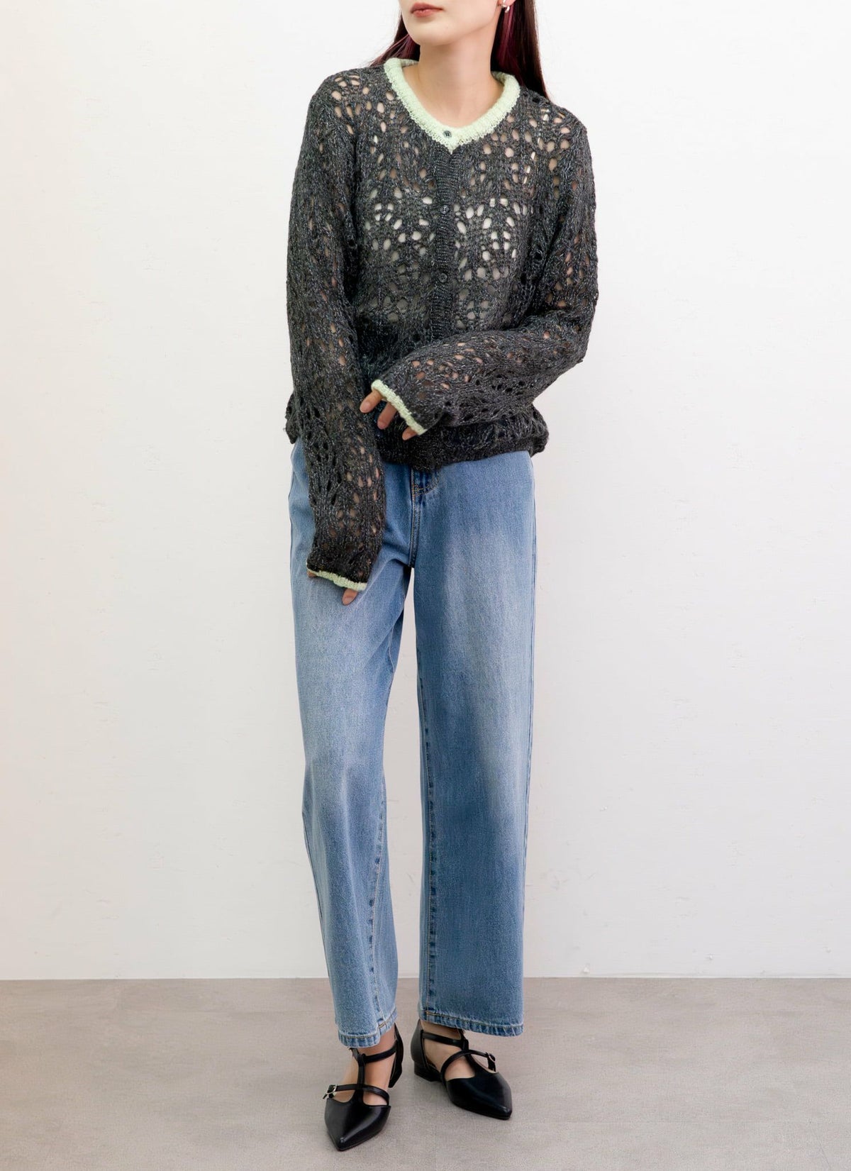 revoam【透かし編みが軽やかなニットカーデ】 【20%OFF】透かし柄配色クルーネックカーデ
