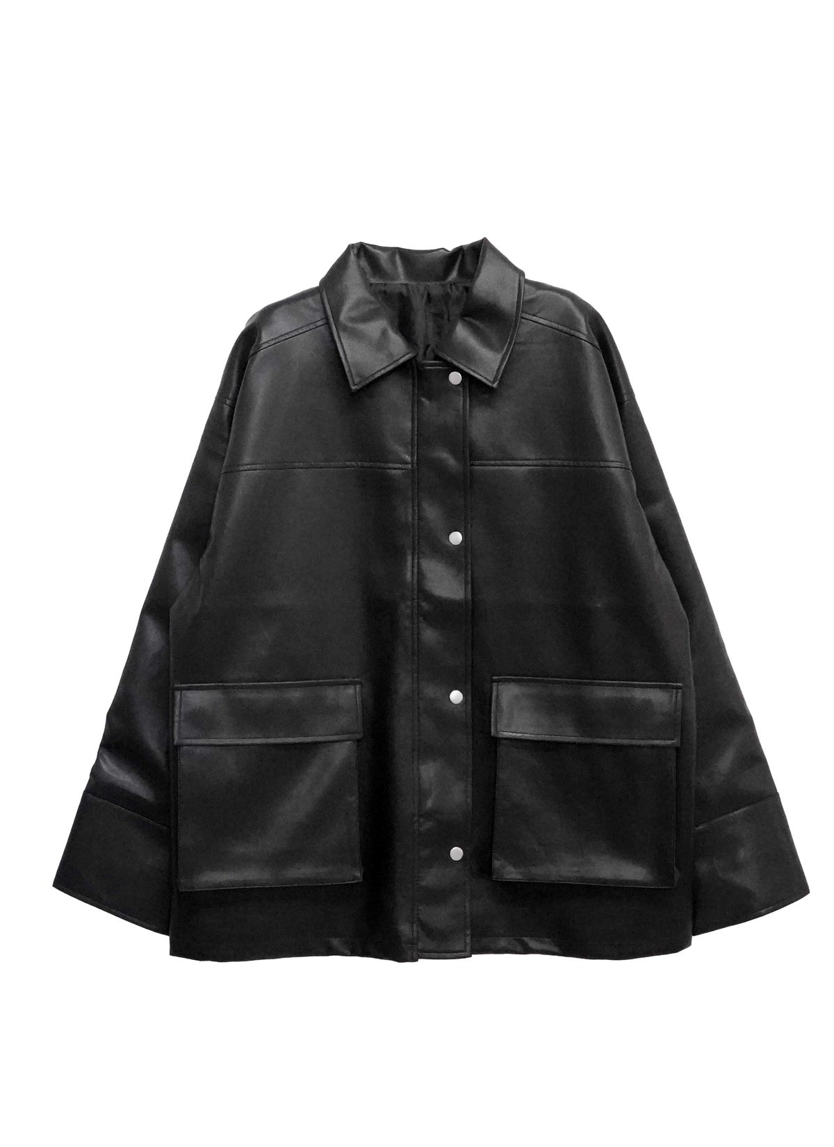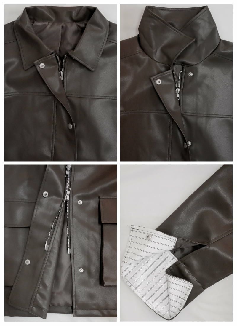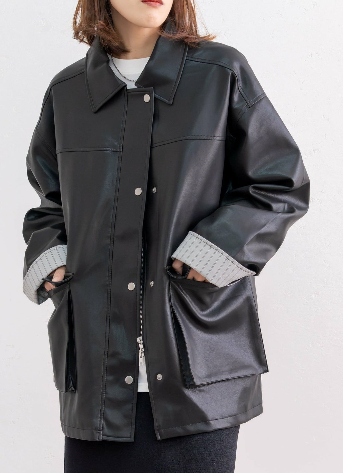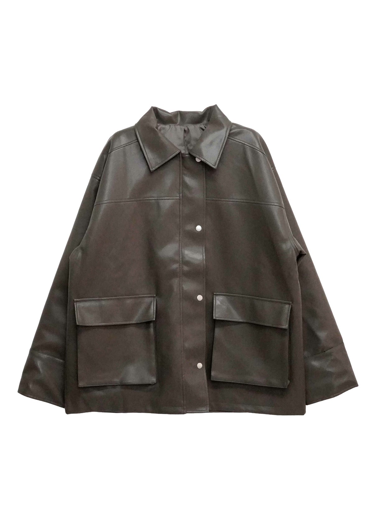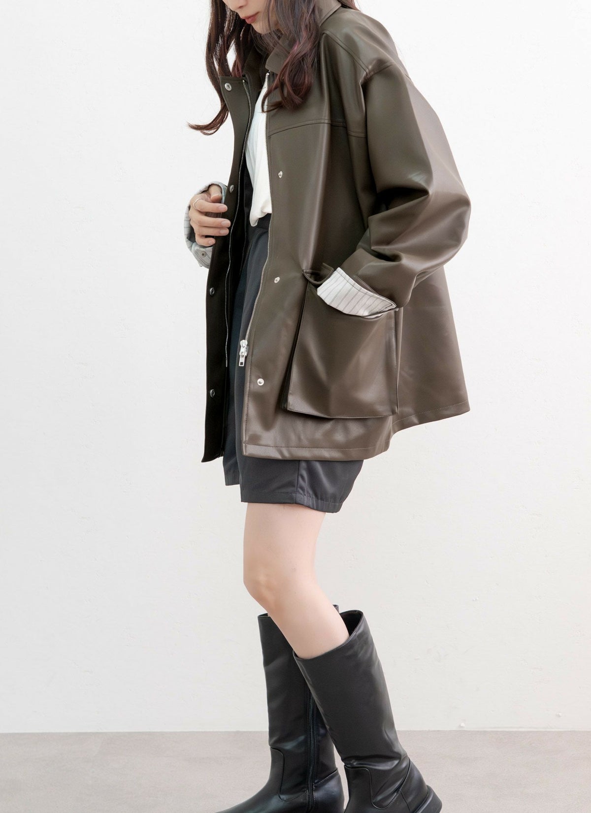 revoam【シーズナブルな雰囲気を高める、フェイクレザーミドルカバーオール