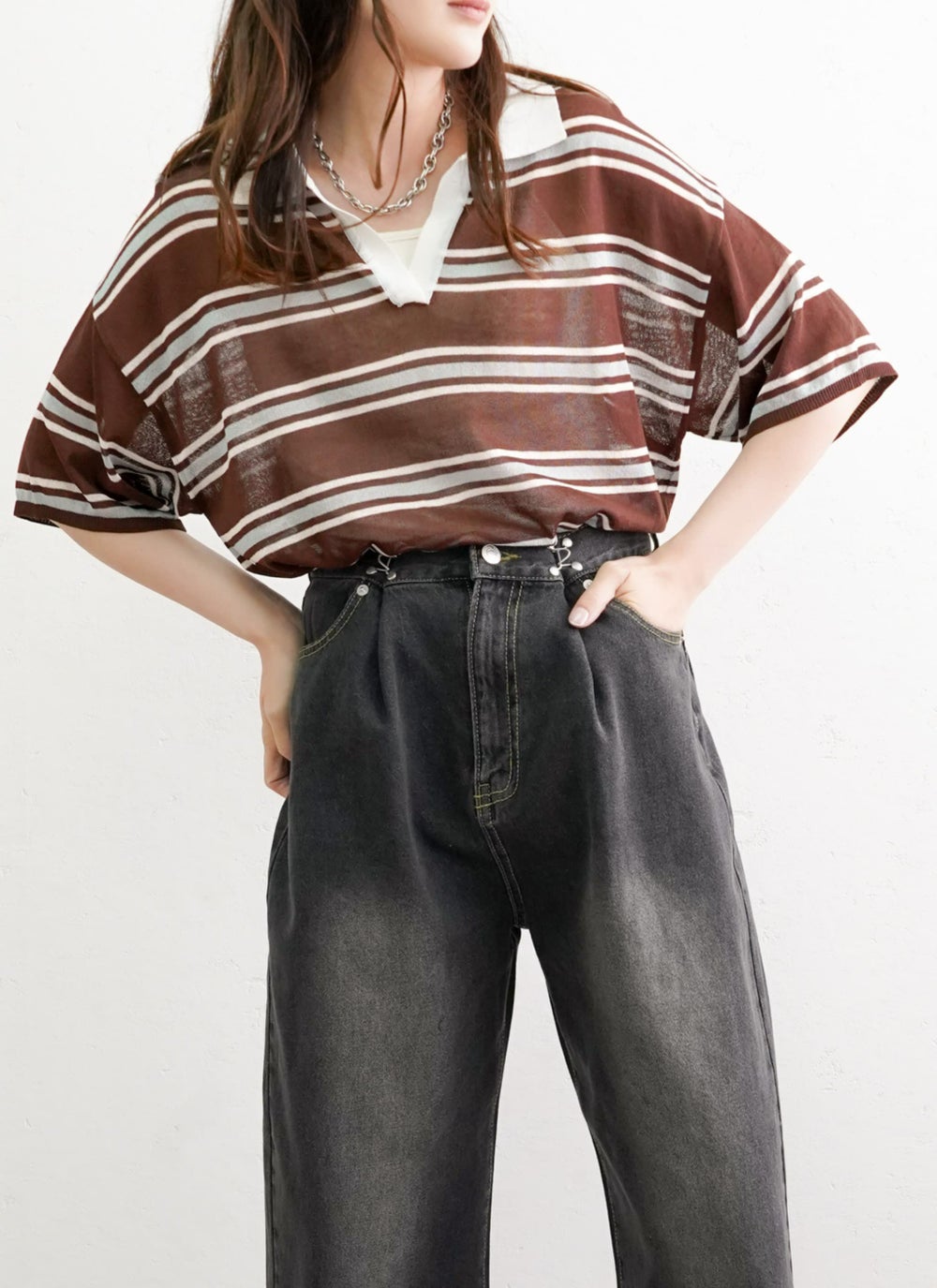 ワイドパンツやデニムと合わせて抜け感を楽しむカジュアルスタイルに。