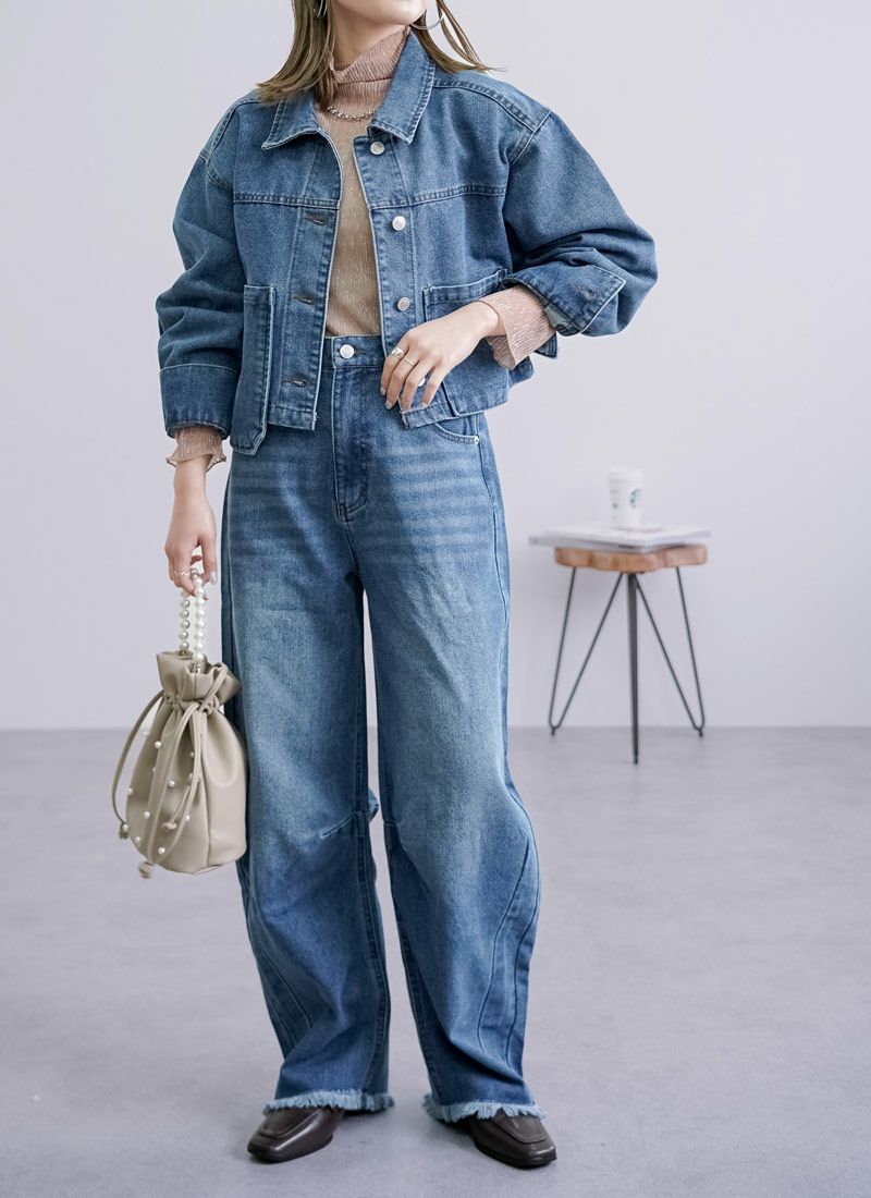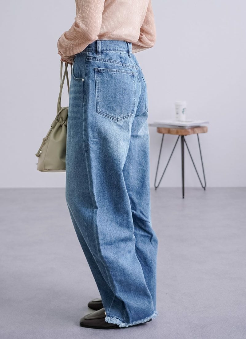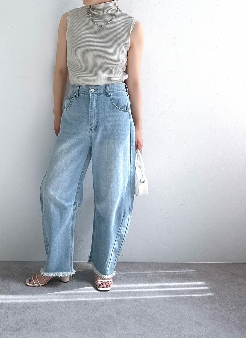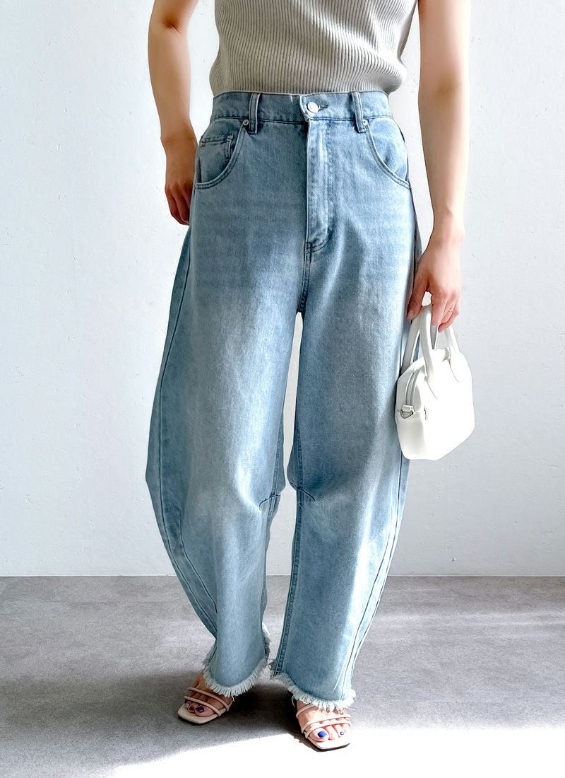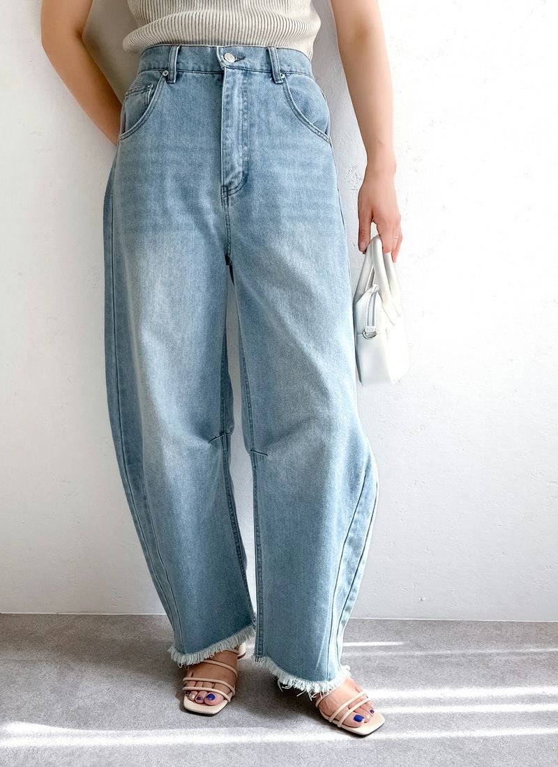 revoam【抜け感と女らしさを叶えるカーブデニム。ゆるっと感と絶妙シルエットで、大人のデニムコーデを格上げ】 【10%OFF】裾フリンジデニムカーブパンツ
