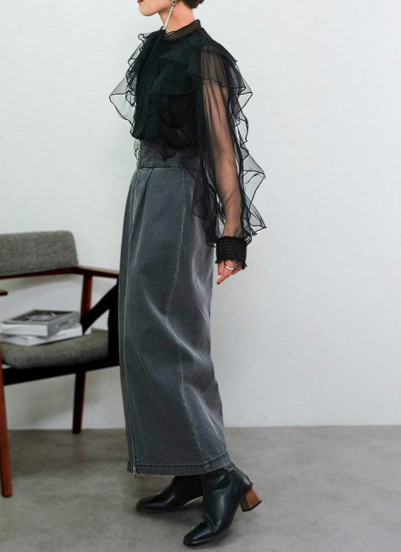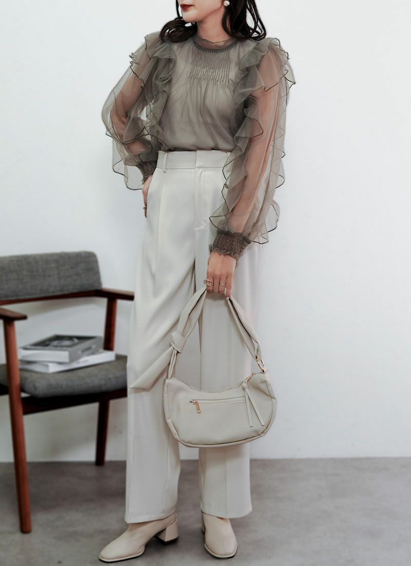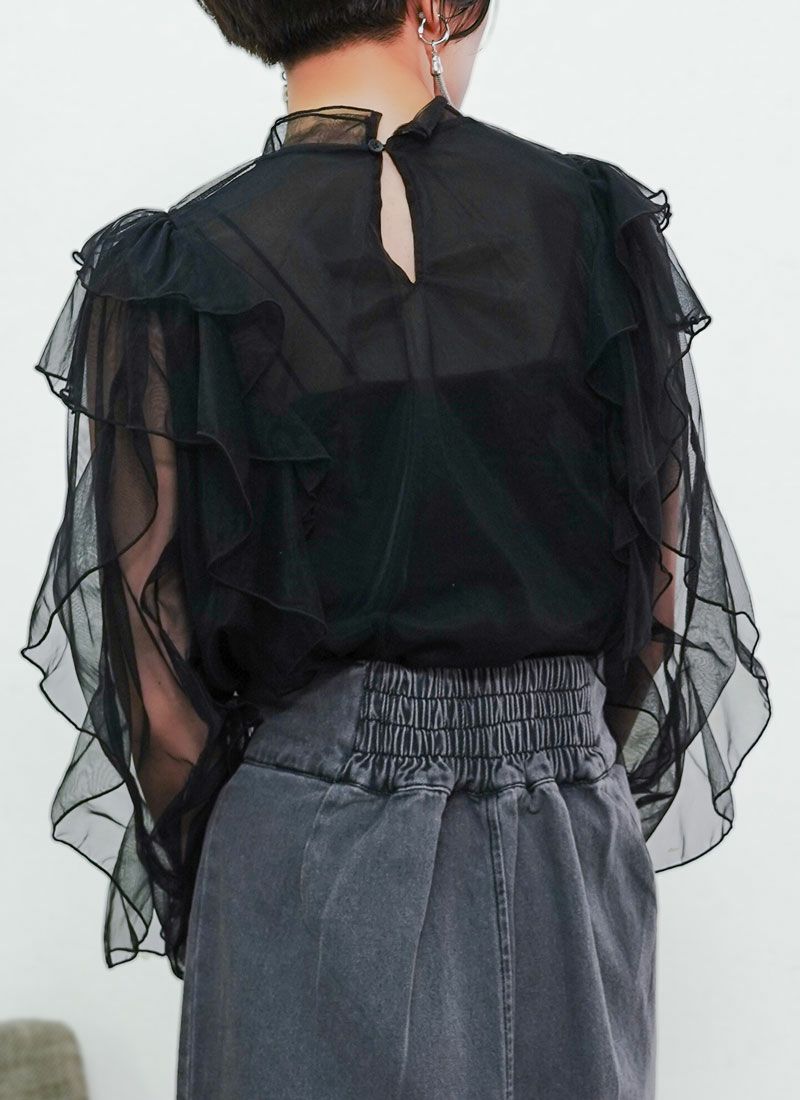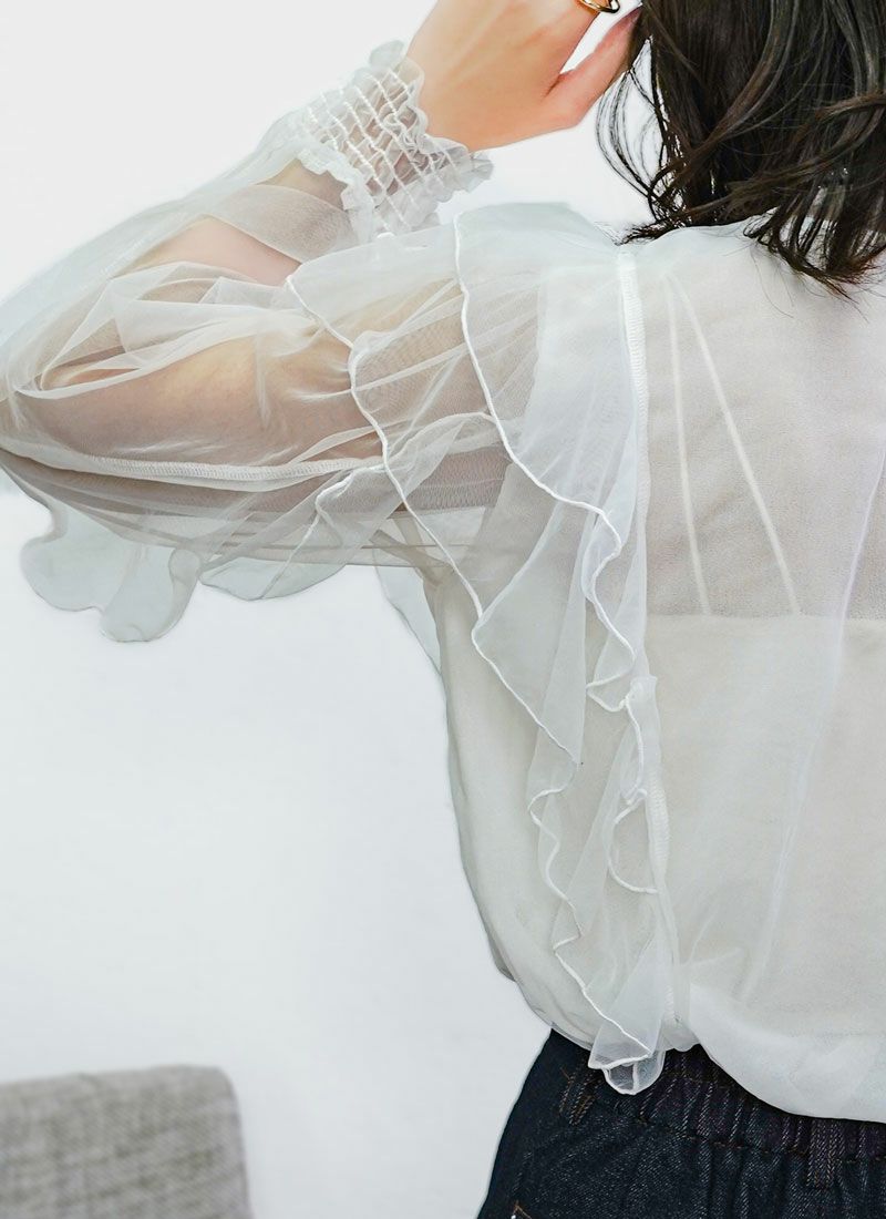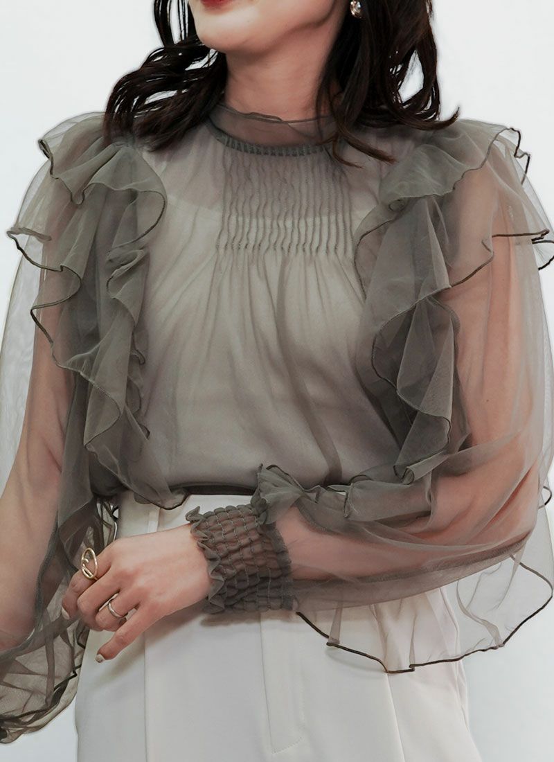 revoam【シアーな透け感で女性らしさをプラス。二次会やパーティーに映えるきれいめブラウス】 【30%OFF】ピンタックフリルブラウス