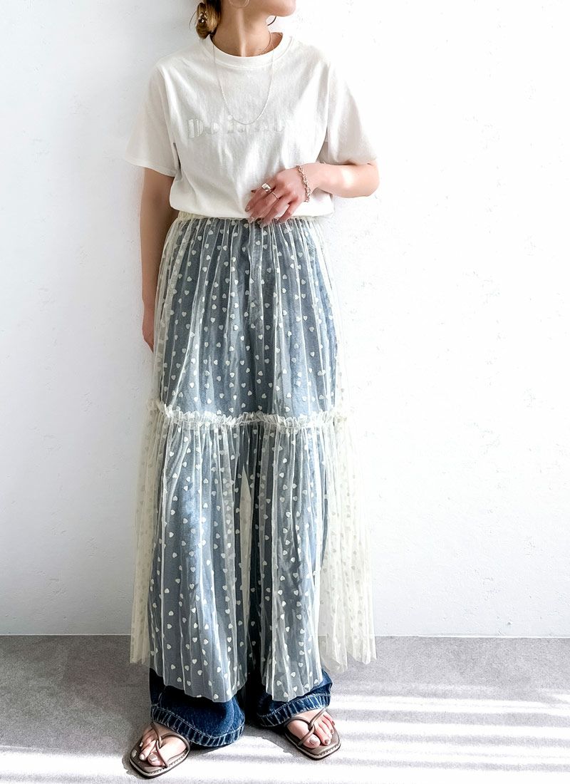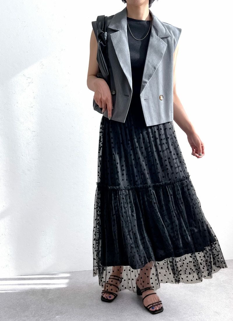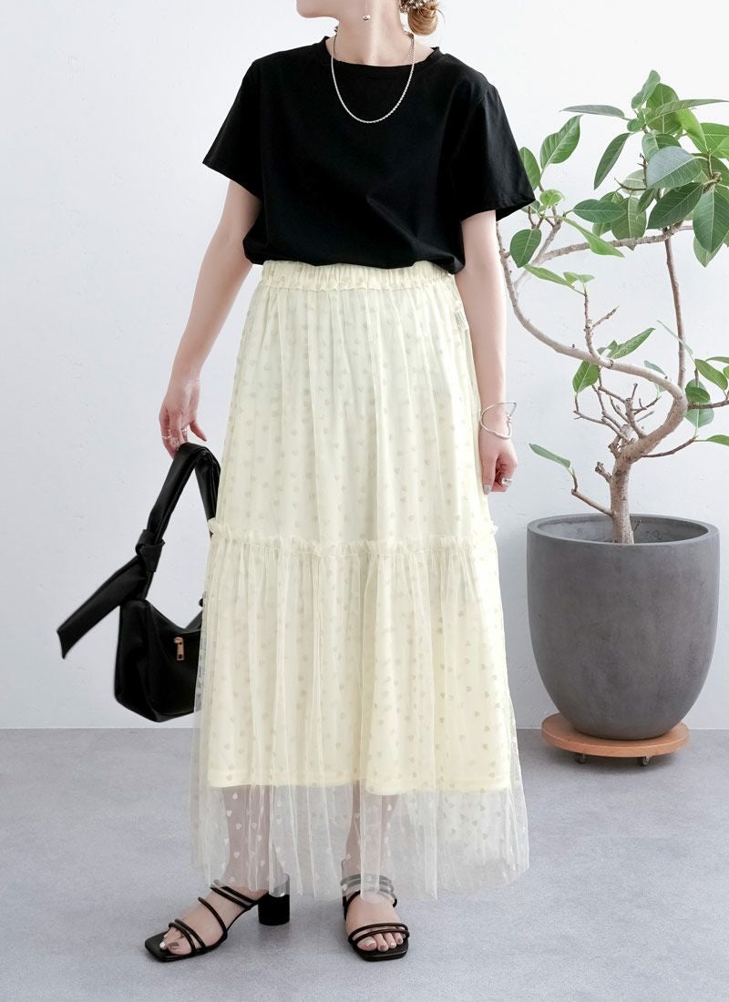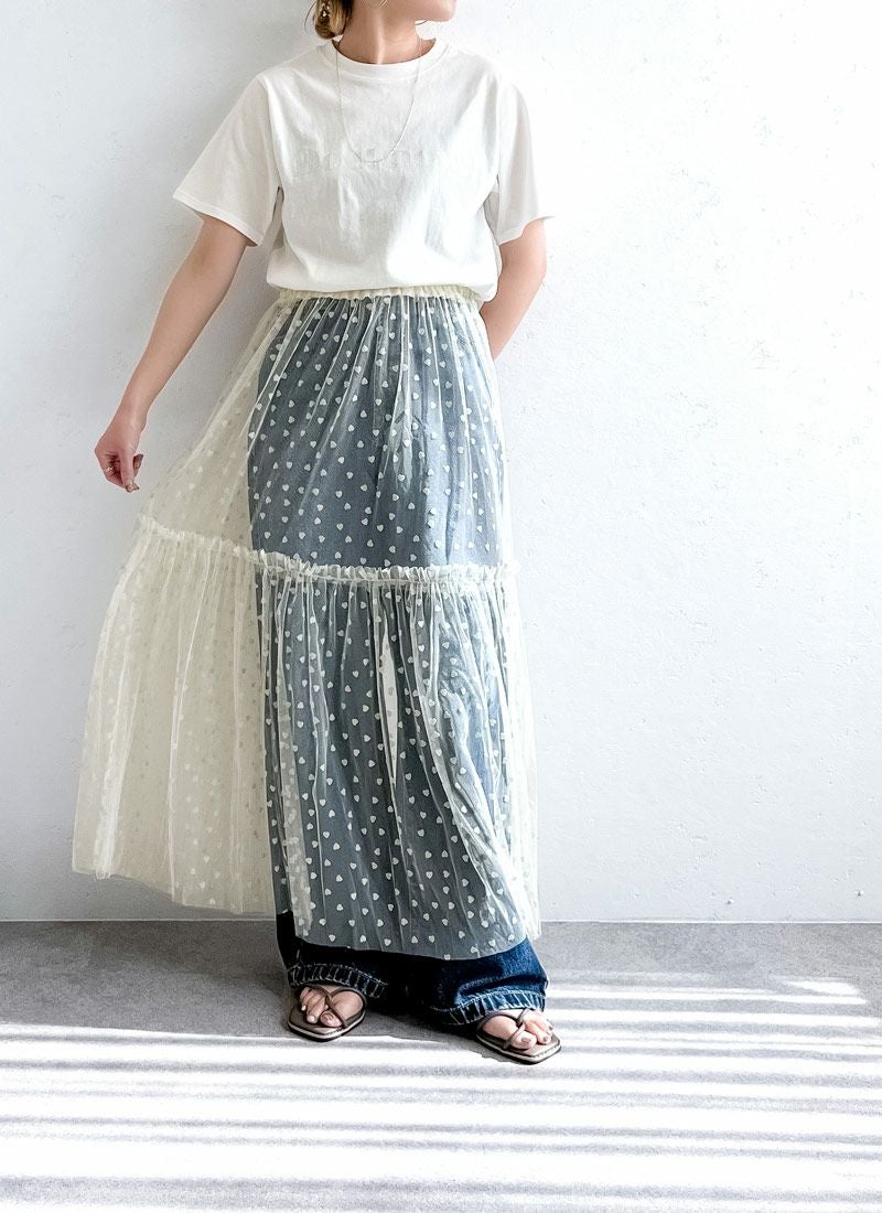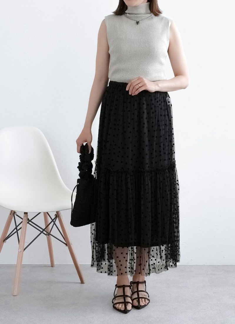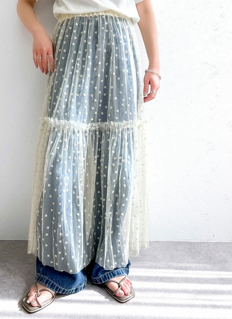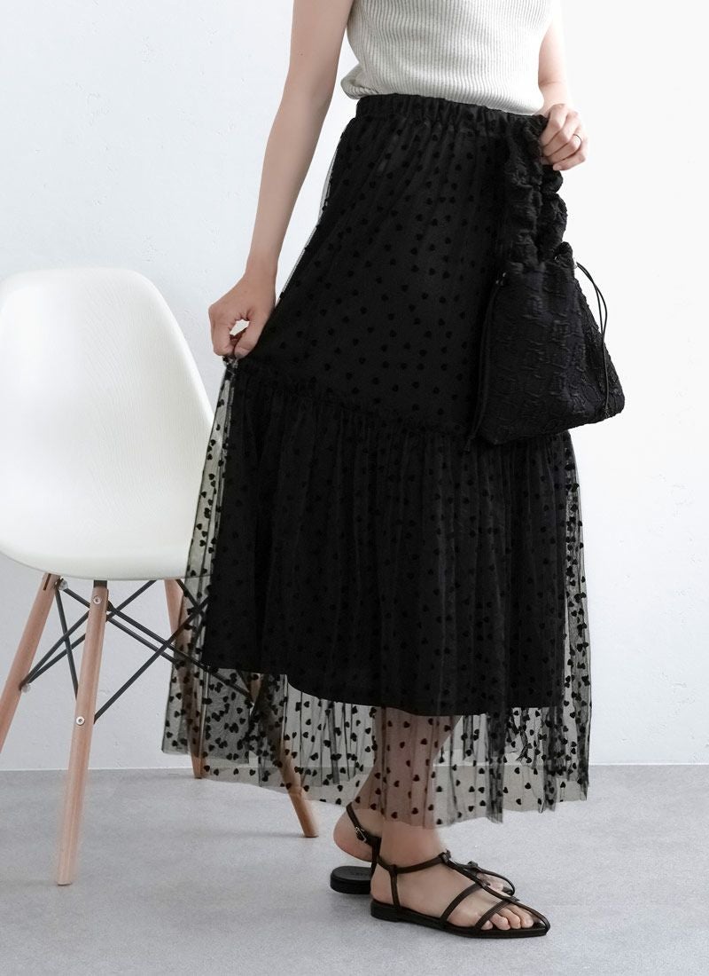 revoam【きゅんとする可愛さを大人っぽく。甘くなりすぎないハート柄と透け感が、洗練された印象に】 【25%OFF】チュールハートフロッキーフレアスカート