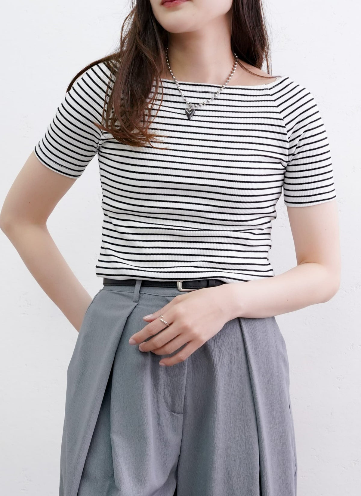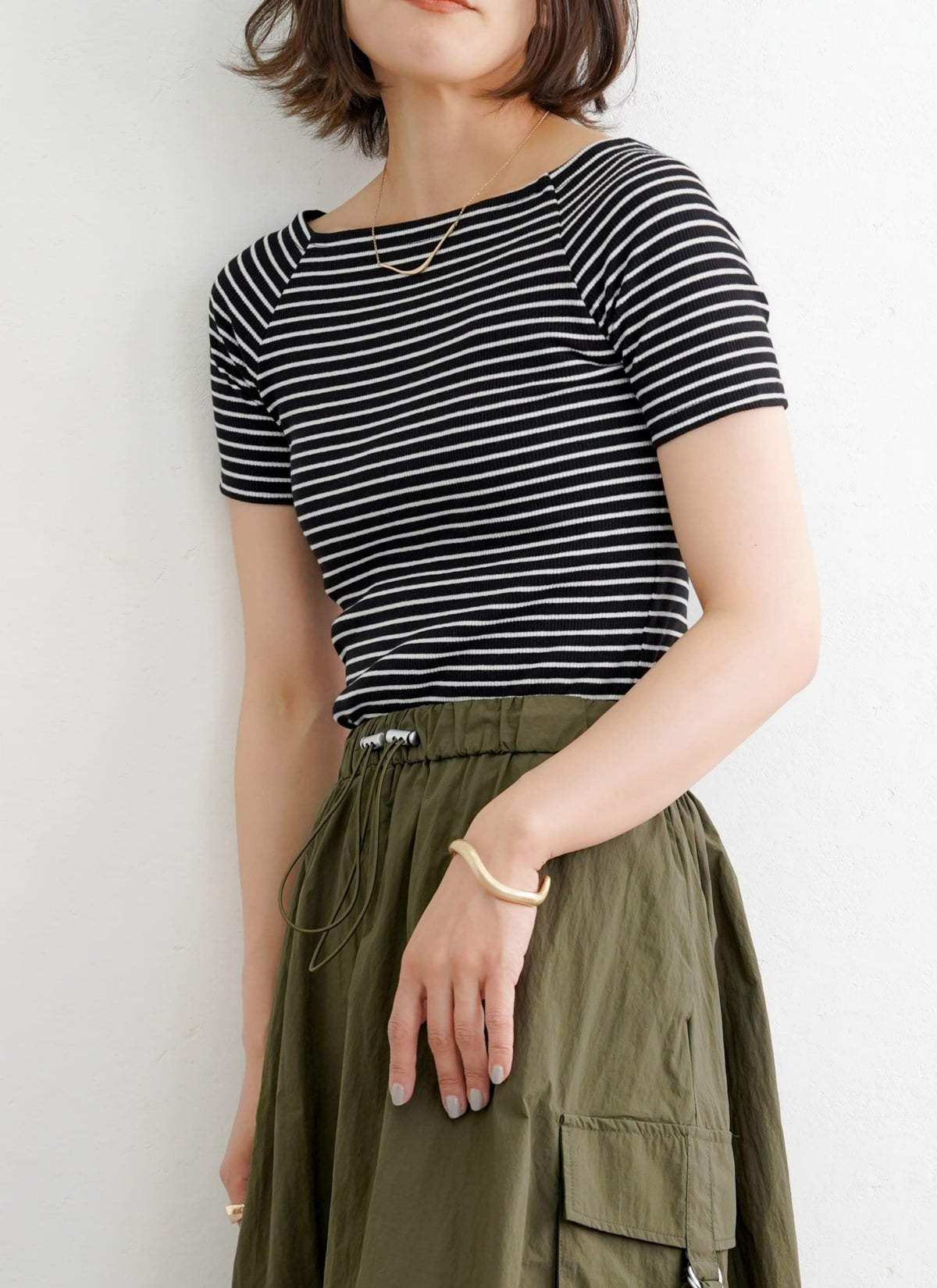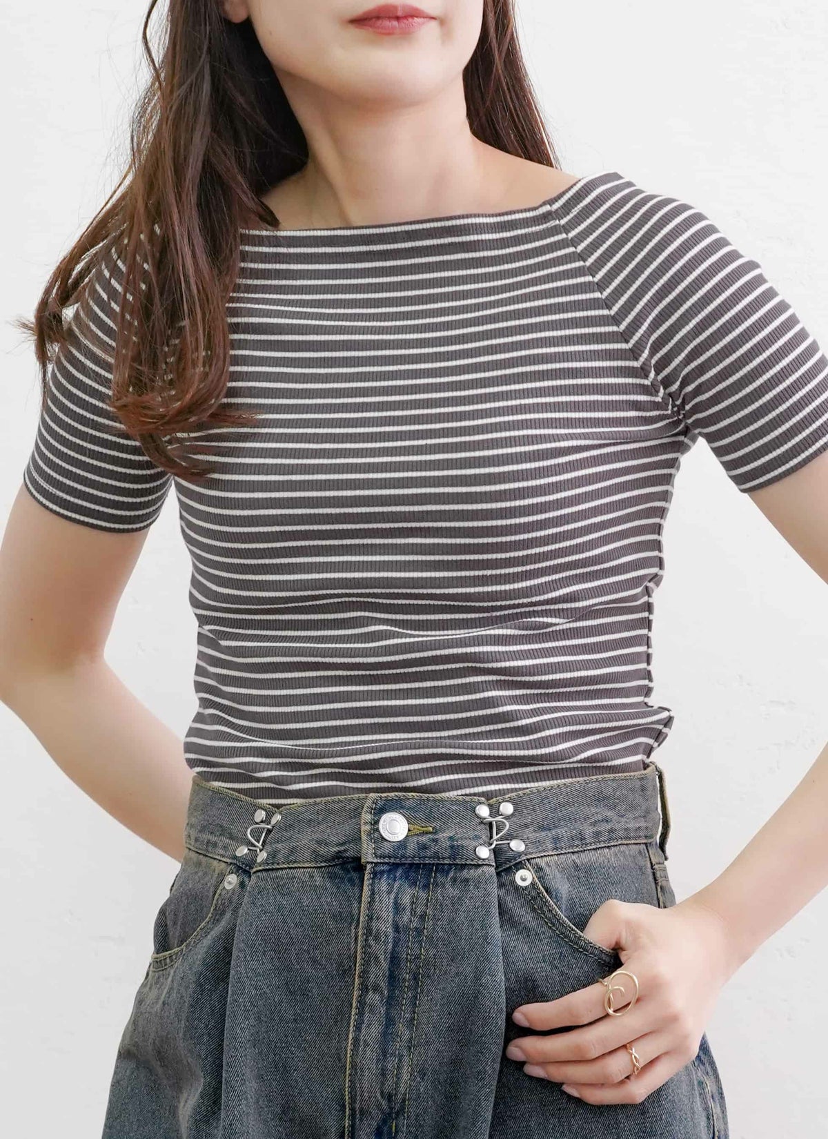revoam【華奢な雰囲気を演出するボーダートップス】 ボーダーリブオフショルトップス