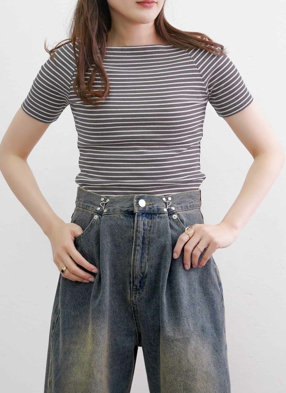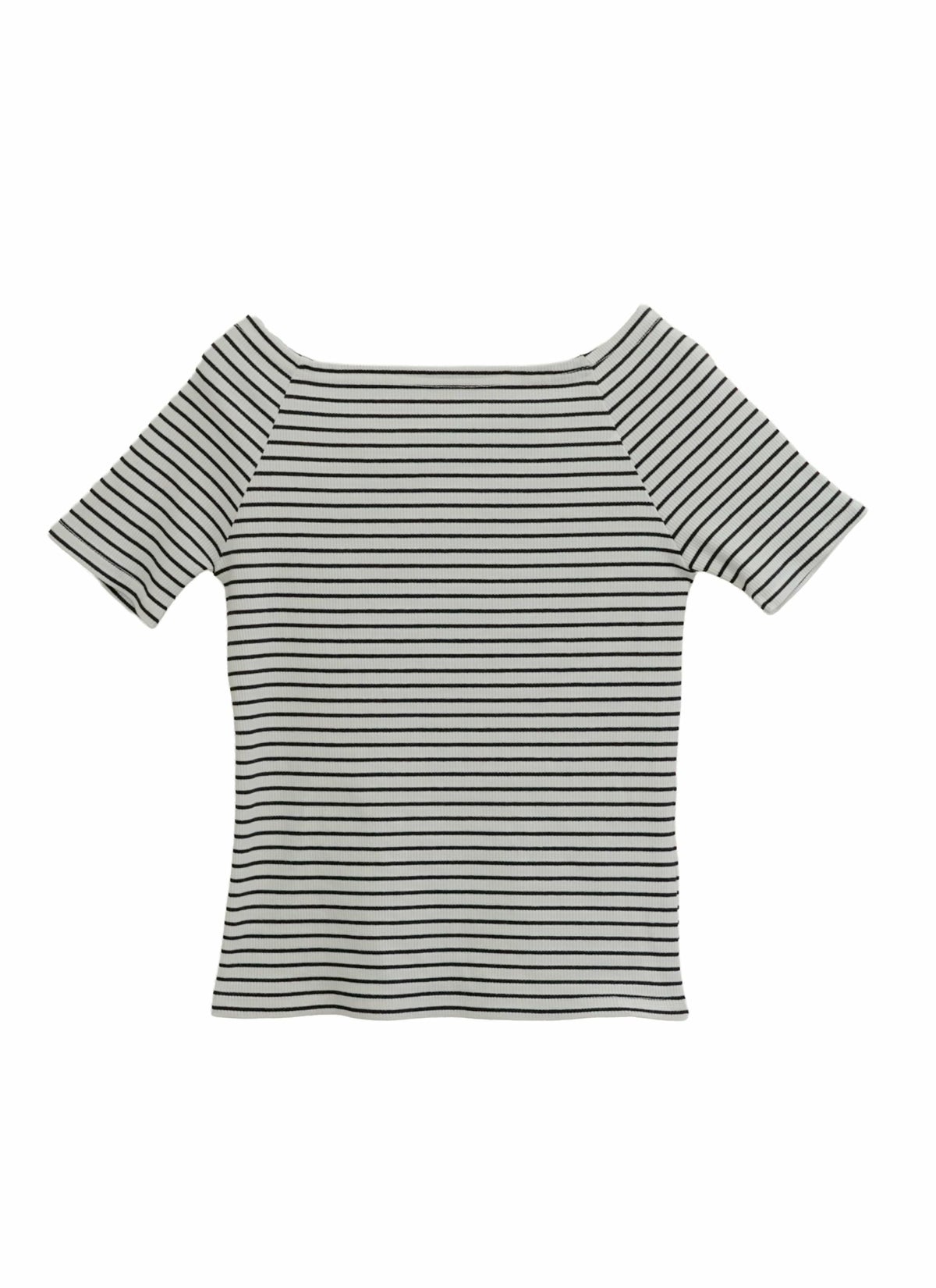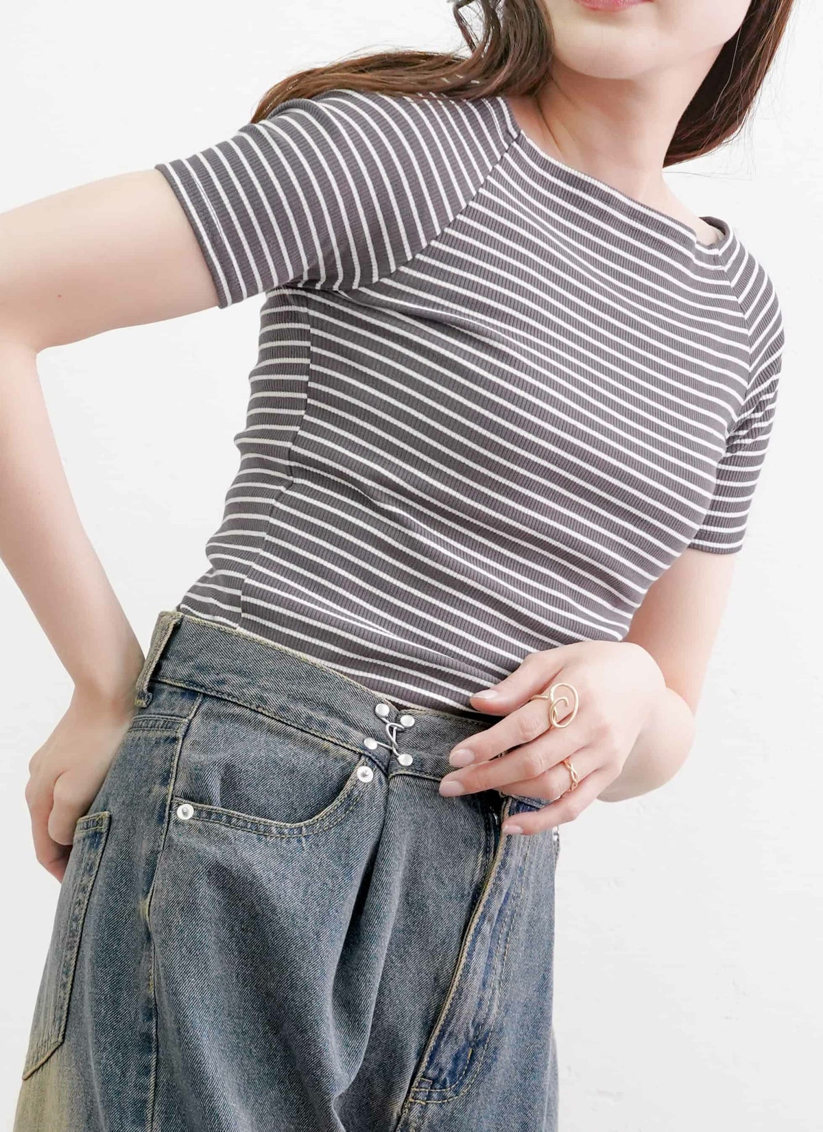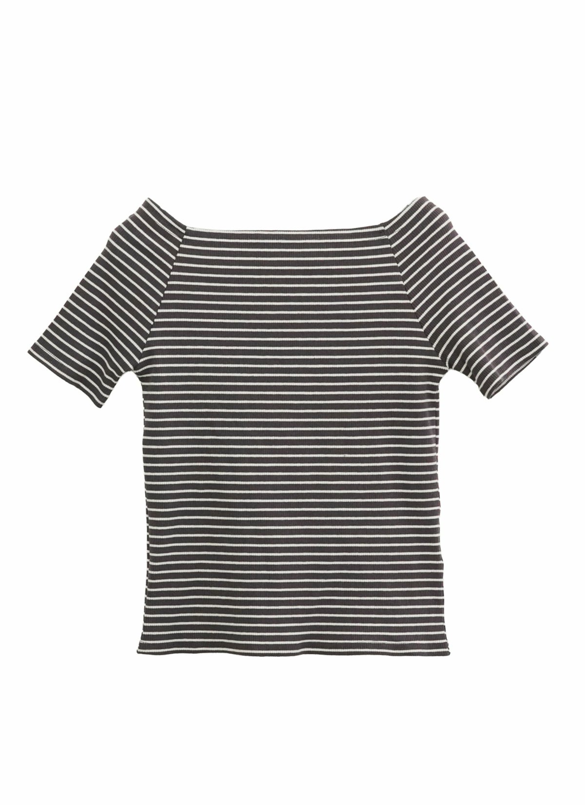 revoam【華奢な雰囲気を演出するボーダートップス】 ボーダーリブオフショルトップス