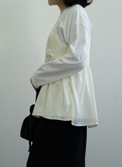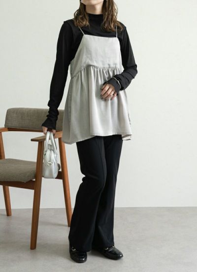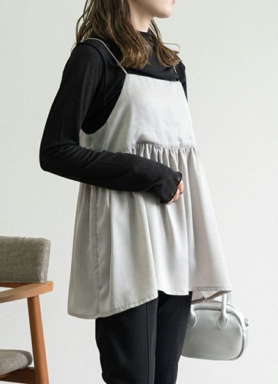 人気のキャミトップスシリーズにサテン素材が新登場* たっぷりギャザーがよったボリュームのシルエットで 女性らしい印象に仕上げてくれるトレンドのキャミTOPS!