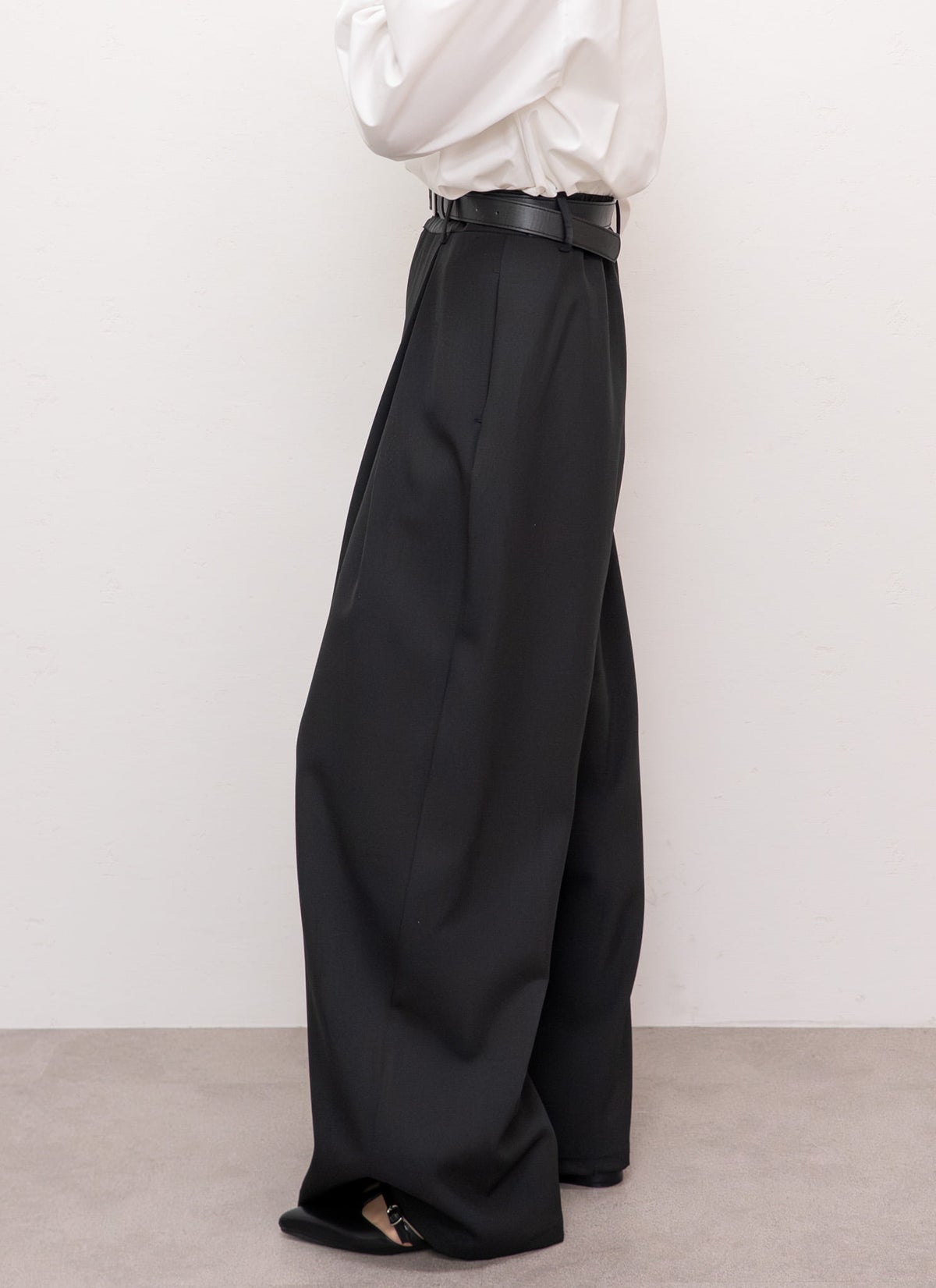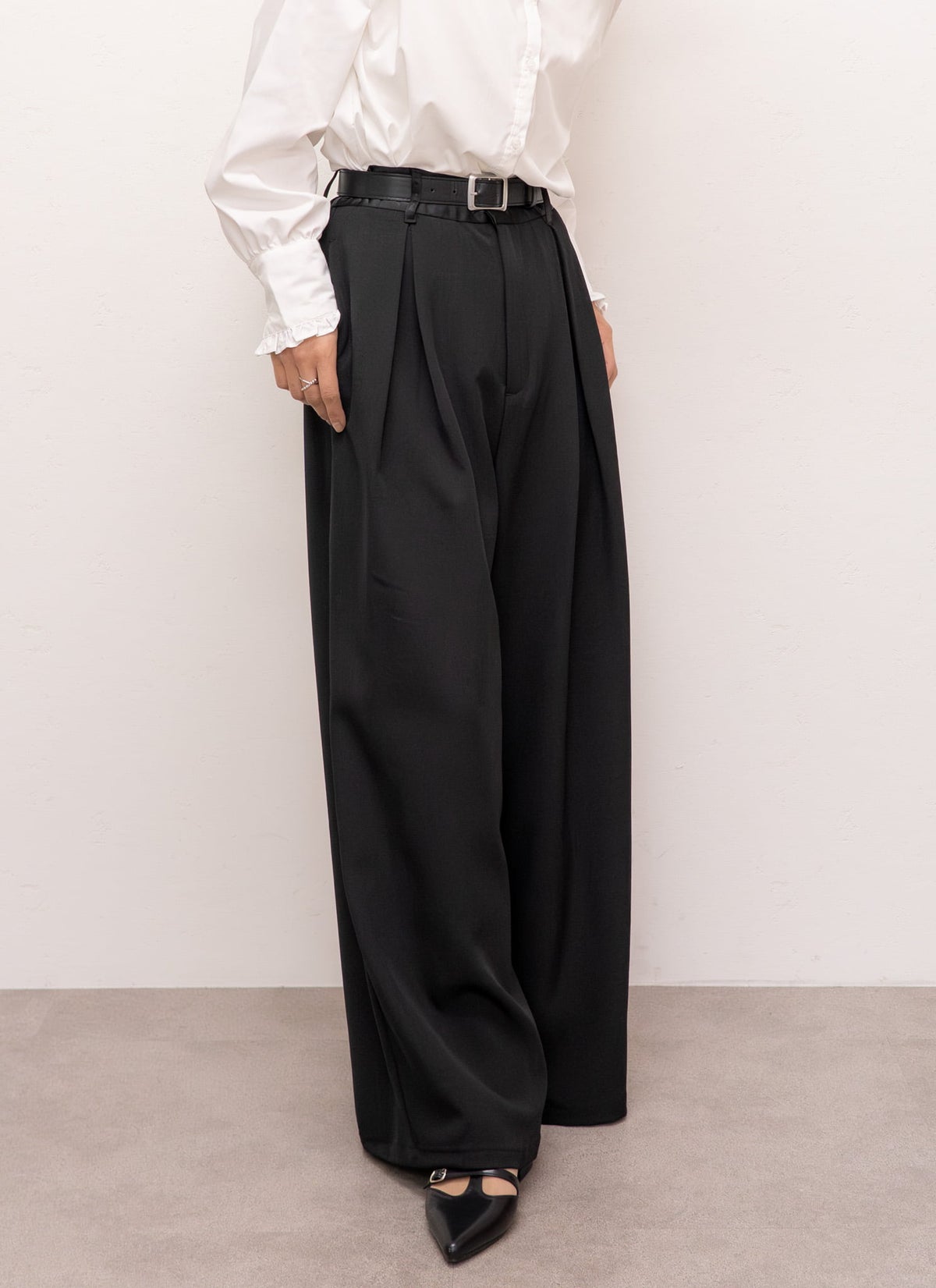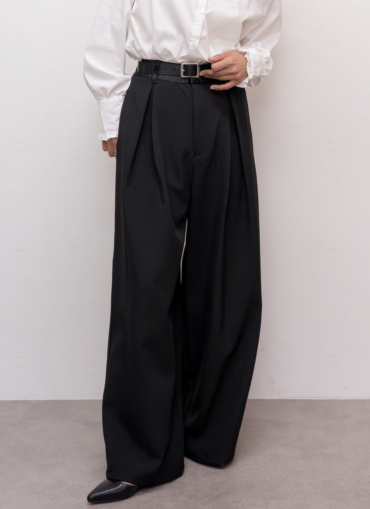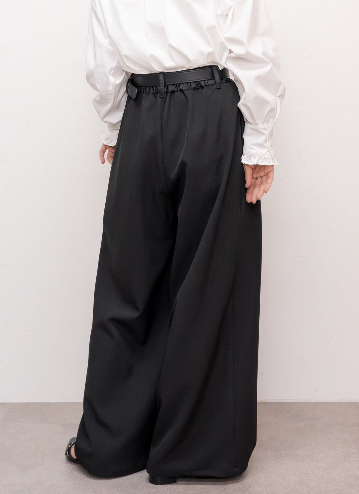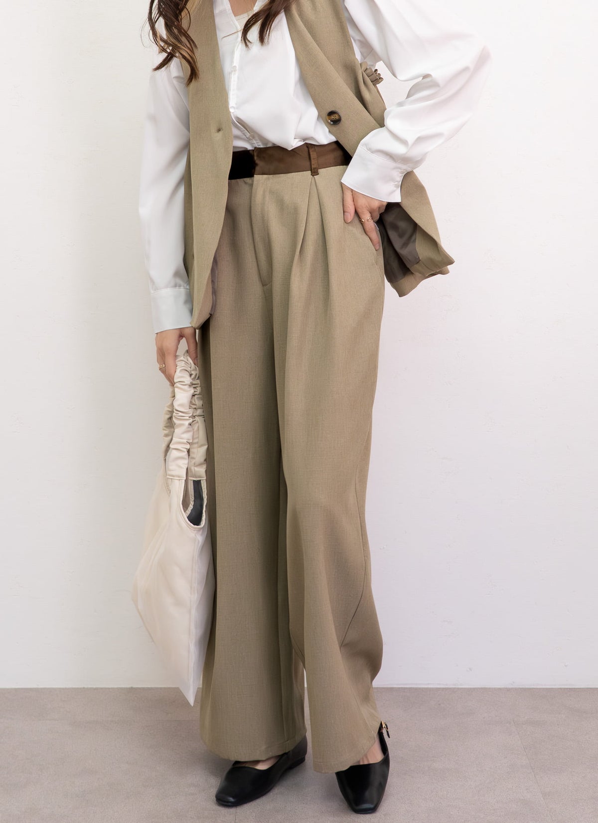 revoam【ウエストマークで、脚長革命。配色デザインが光る大人の美ラインワイドパンツ】 サテンベルトタックパンツ