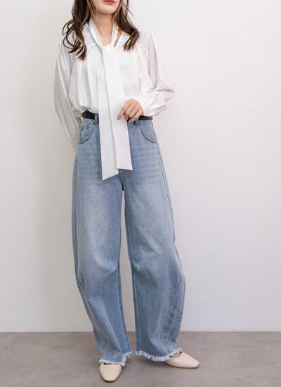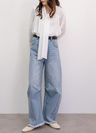 ライトカラーのデニムと合わせることで、きれいめカジュアルな印象に◎