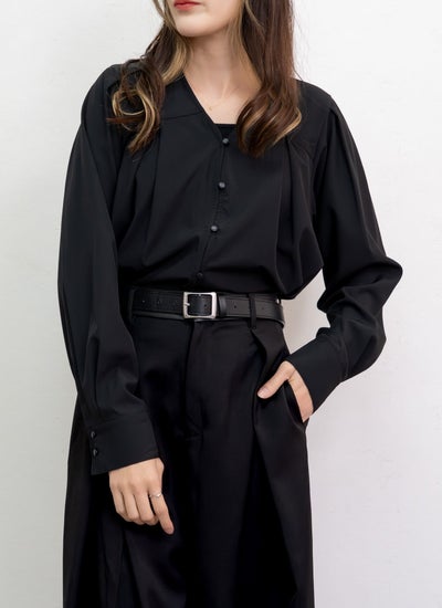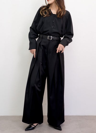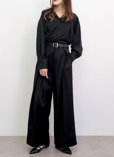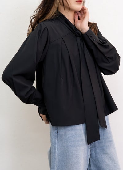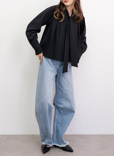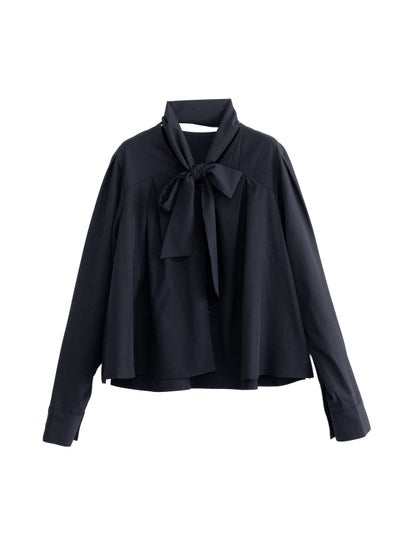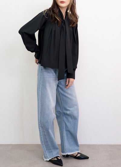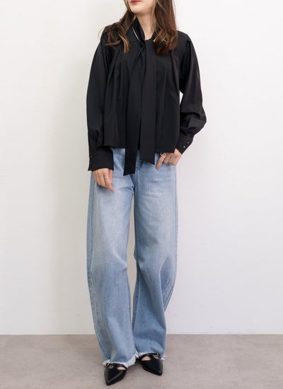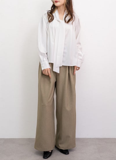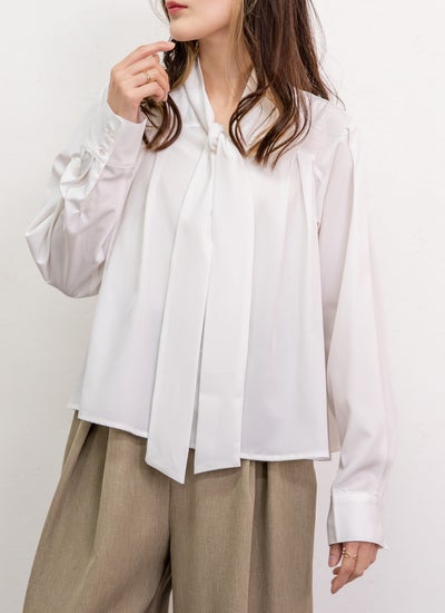 しなやかな落ち感と、程よい光沢のある上品な素材を使用したボウタイブラウス。