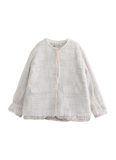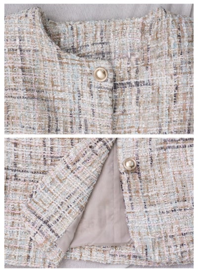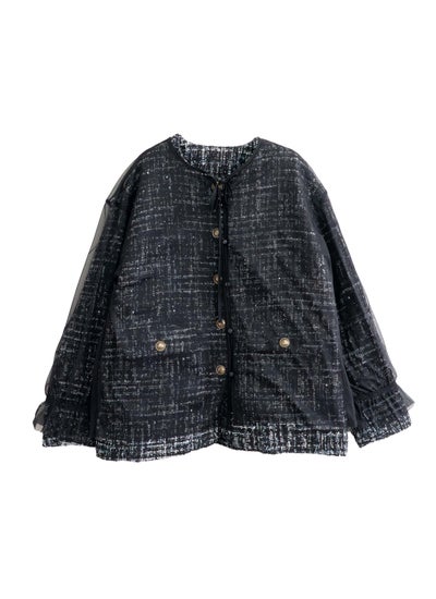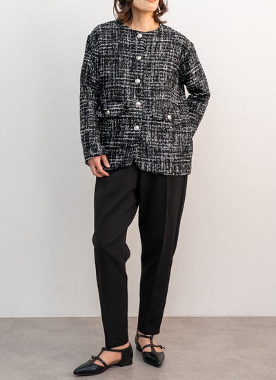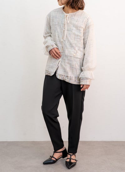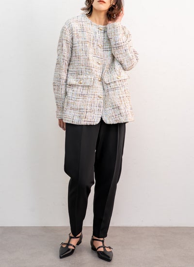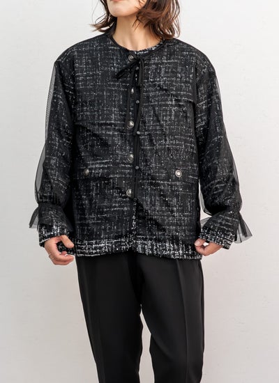 表情豊かなツイード素材に、繊細なチュールを重ねたノーカラージャケット。