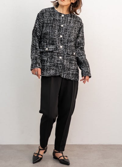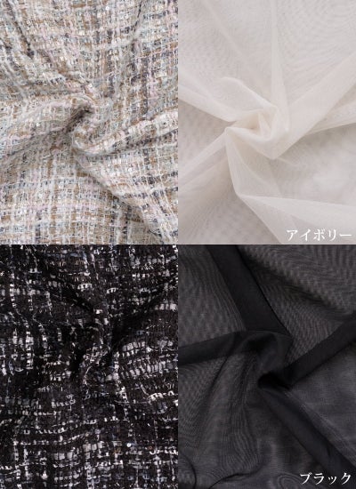 モノトーンにまとめることで重厚感のあるツイードにチュールの透け感が加わり、洗練されたモードな印象を与えます。