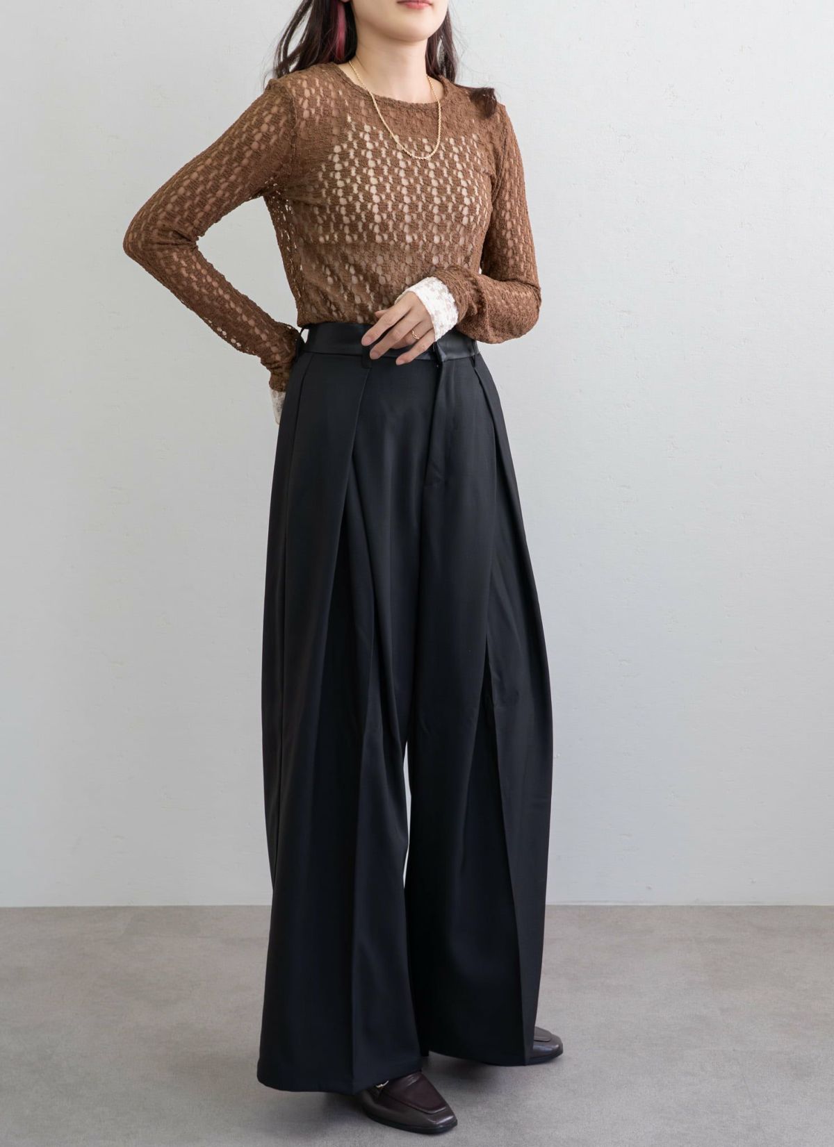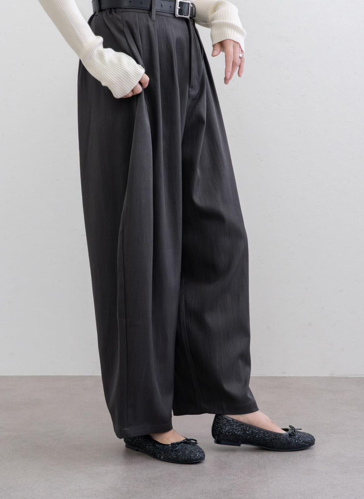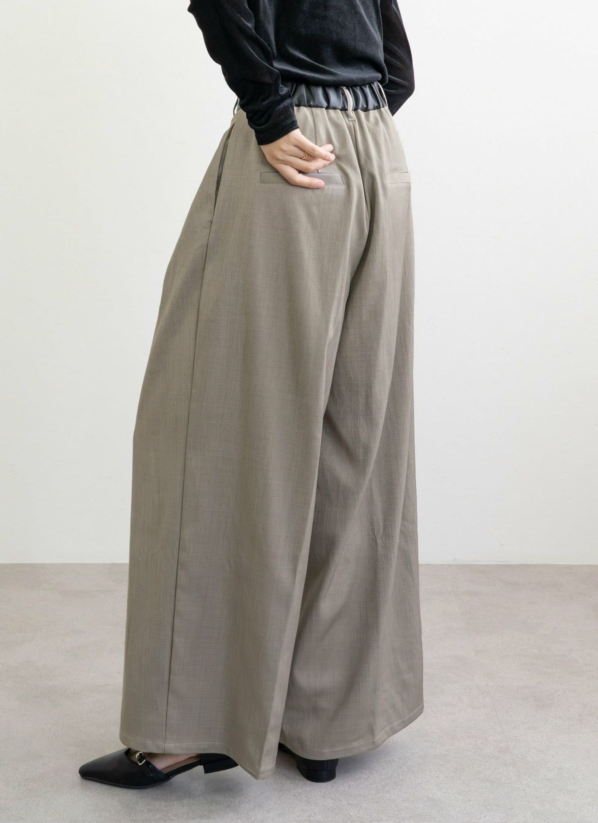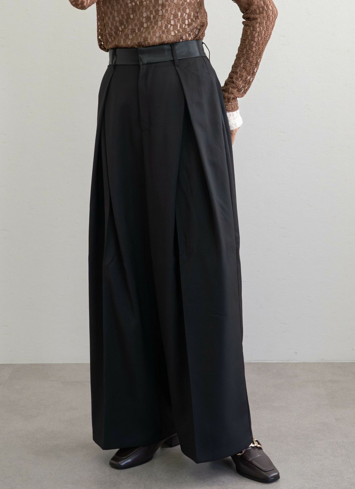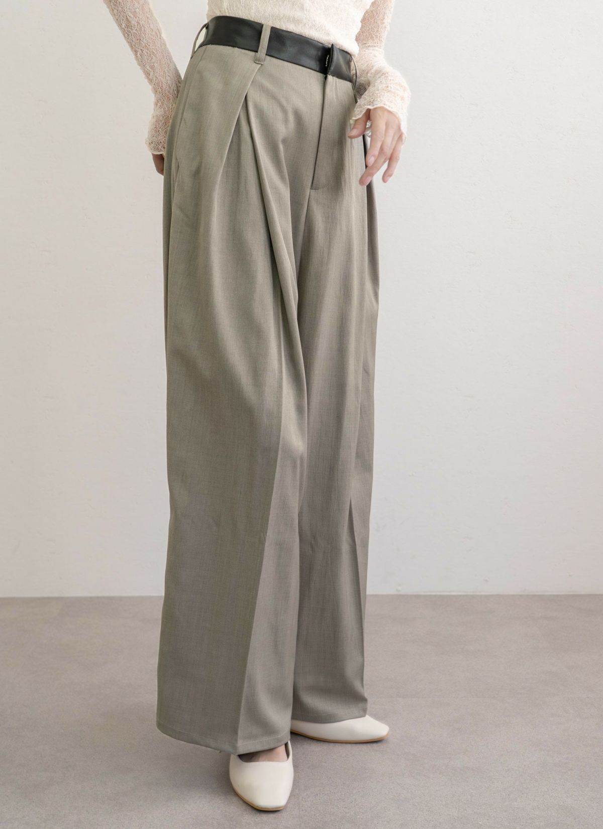 revoam【ウエストのレザーがポイントのタックパンツ】 ウエストレザータックパンツ