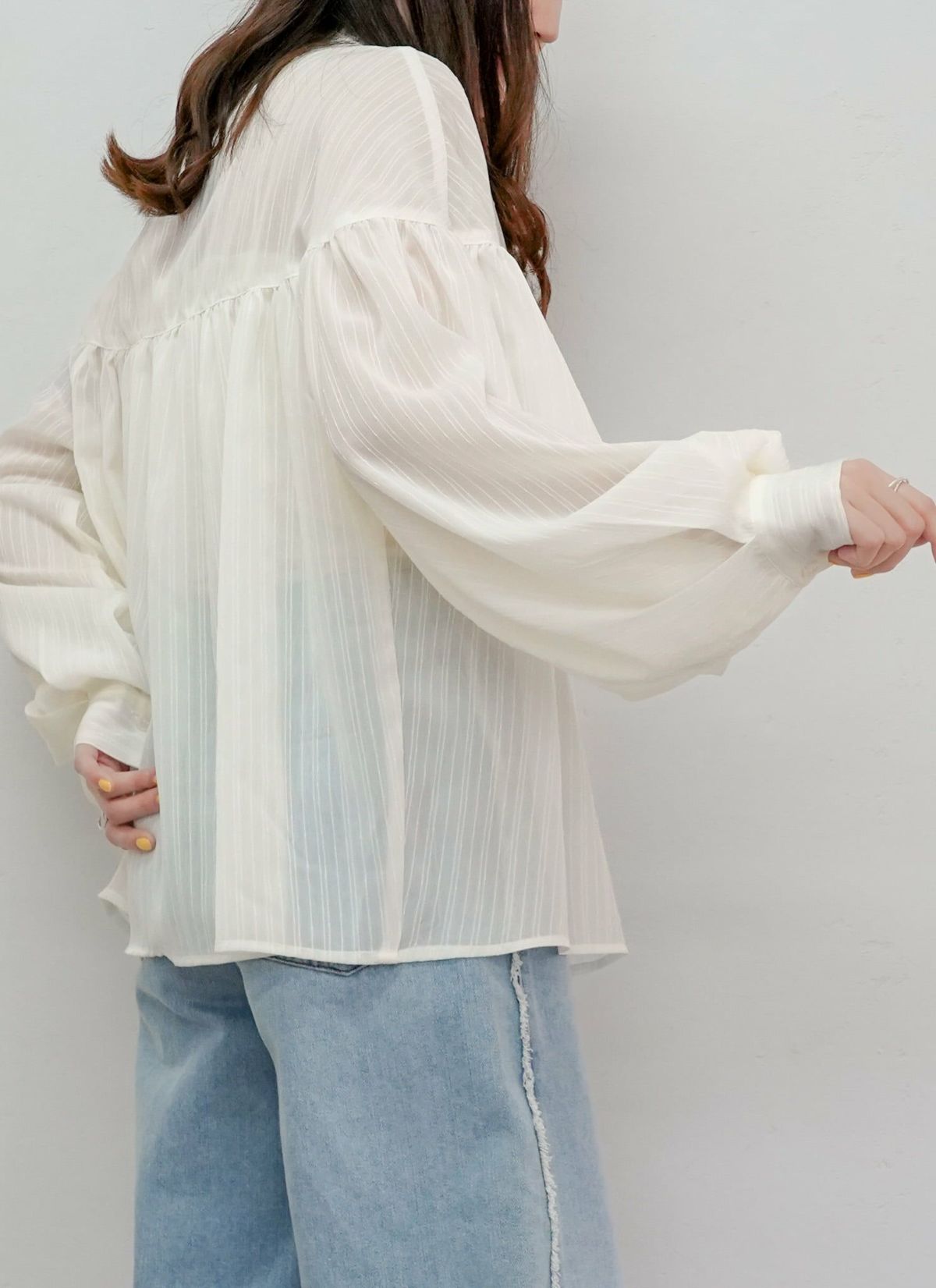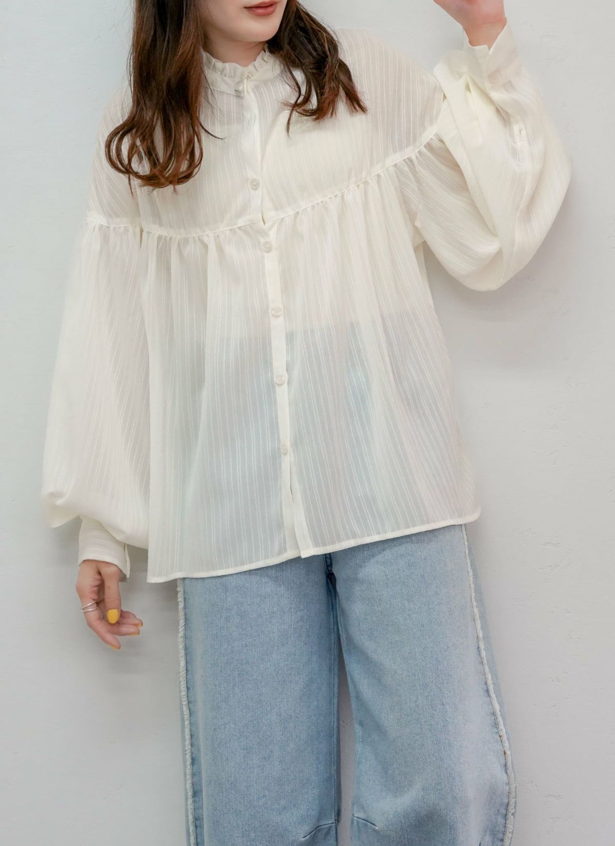 revoam【シアー素材でトレンド感UP! 着回ししやすいフリルブラウス】 シフォンギャザーブラウス