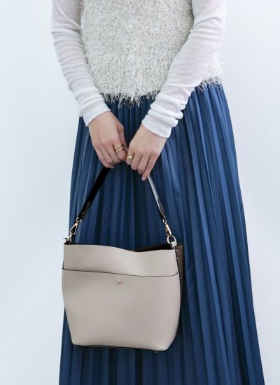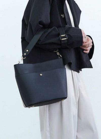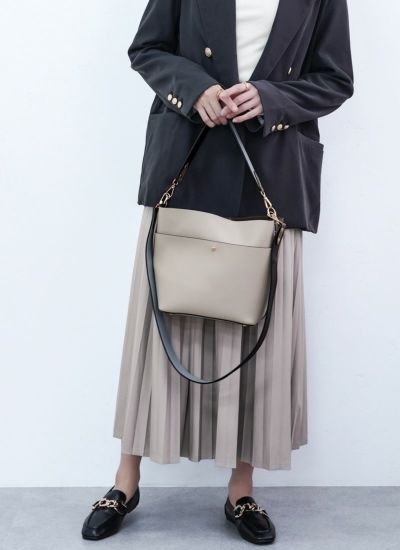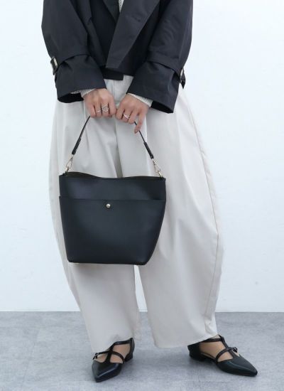 両面使い出来る長短2種のショルダーストラップ付きのWフェイス仕様、小物が出し入れしやすい外ポケット付き。